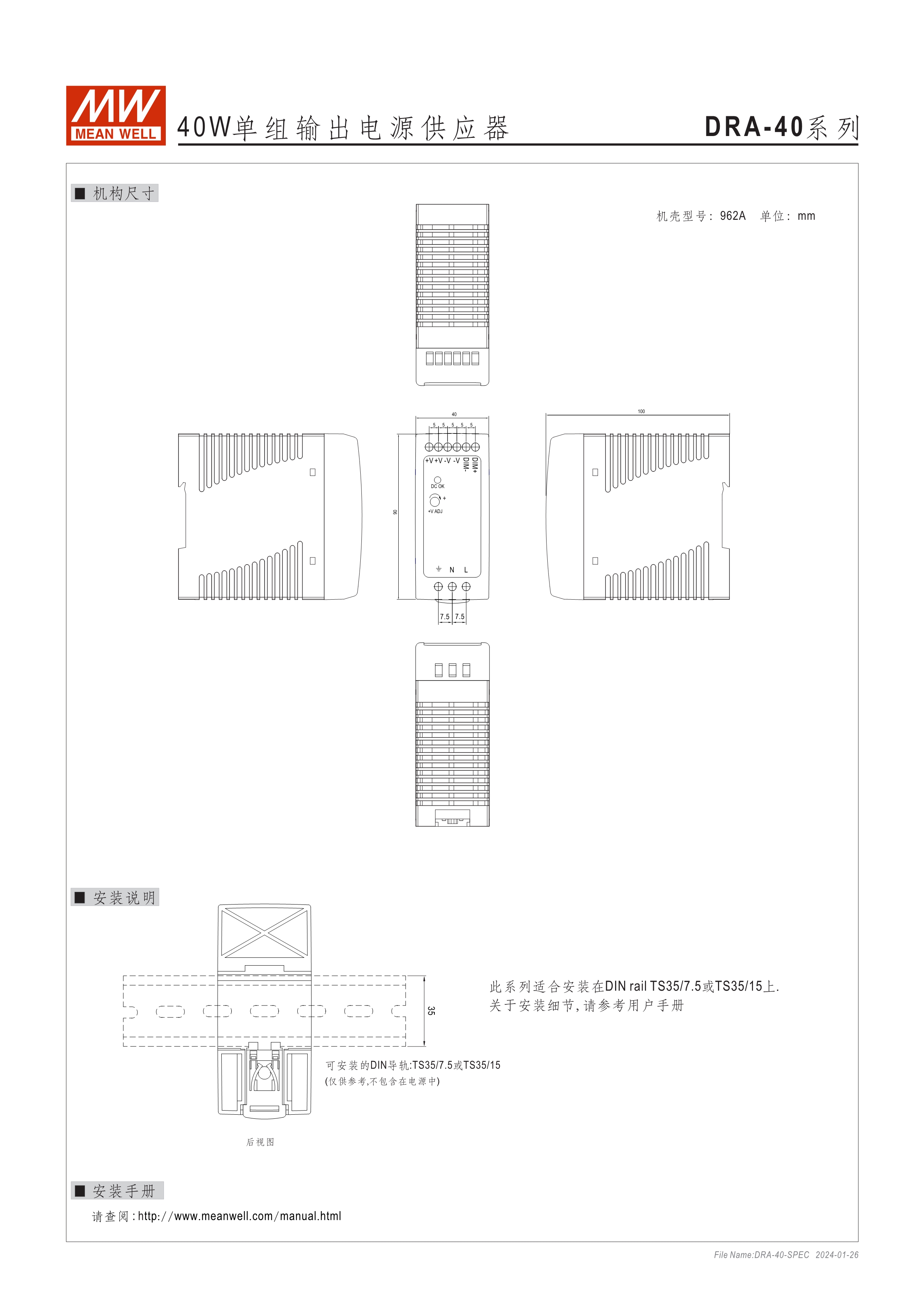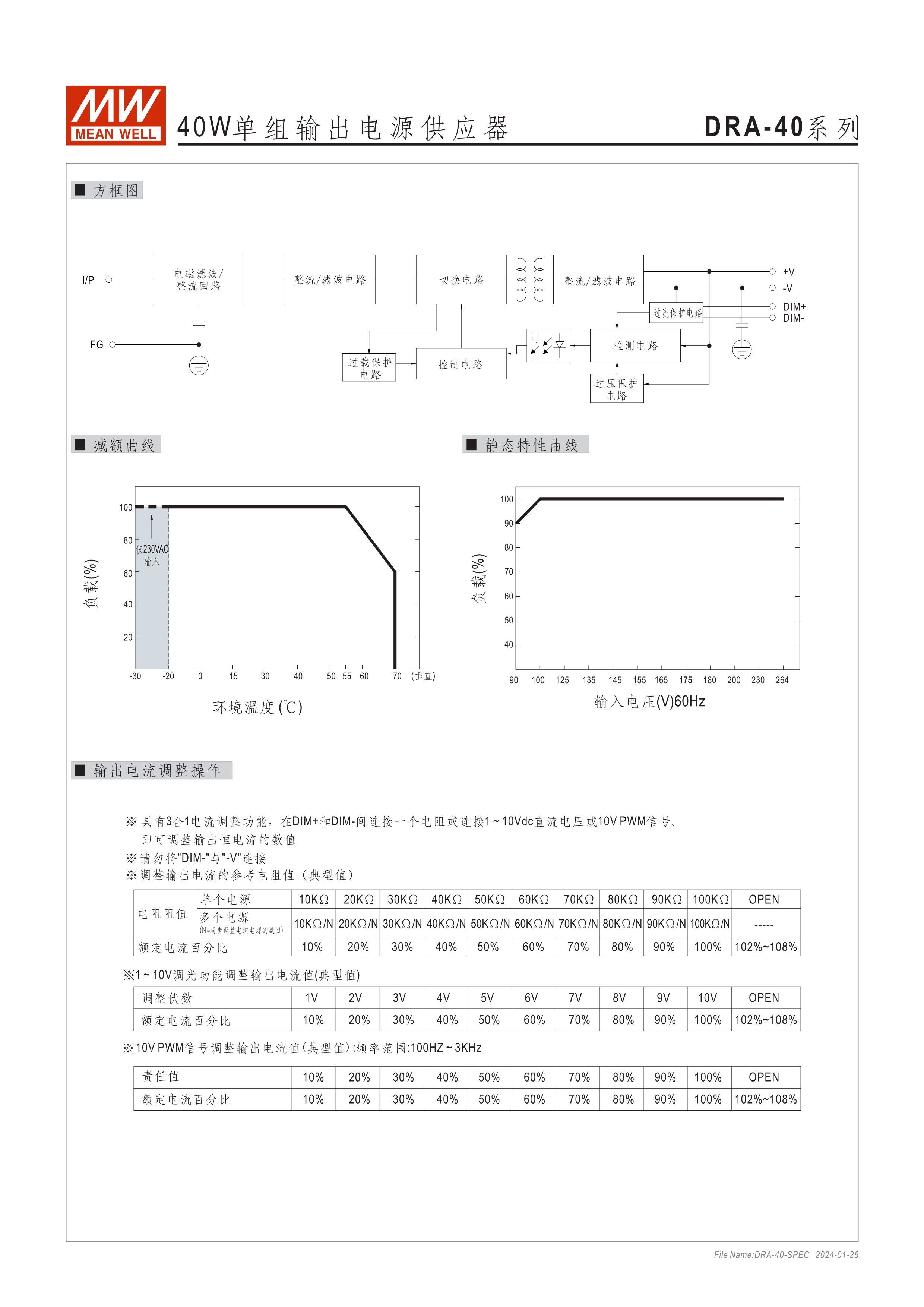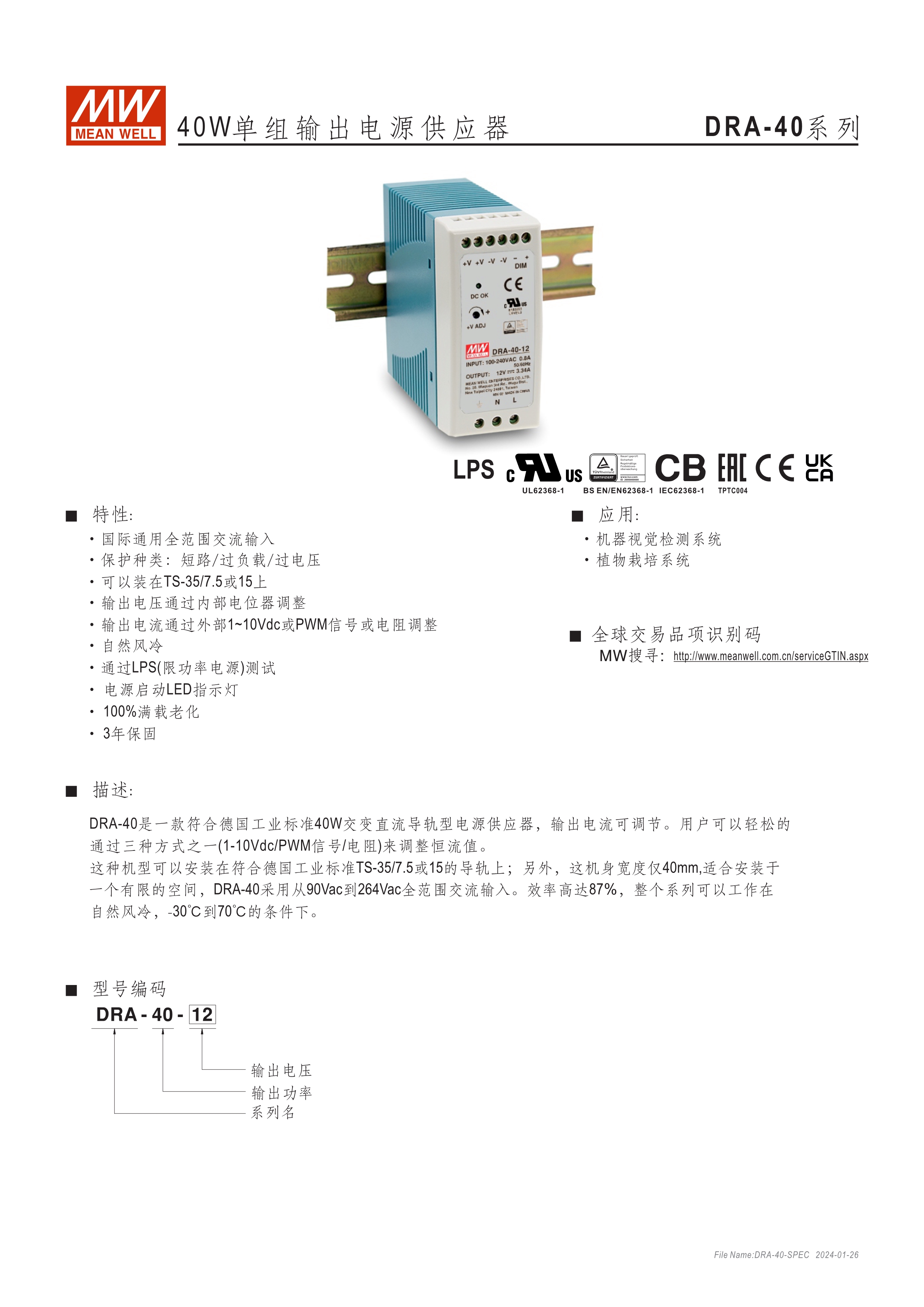 塑料機(jī)殼 單相,全范圍輸入 輸出電流可透過1~10VDC, PWM信號(hào)或電阻調(diào)設(shè)于原額定值的 10~100% 適合安裝于DIN Rail TS-35 / 7.5或15 適合于視覺檢測設(shè)備及植物栽培系統(tǒng)