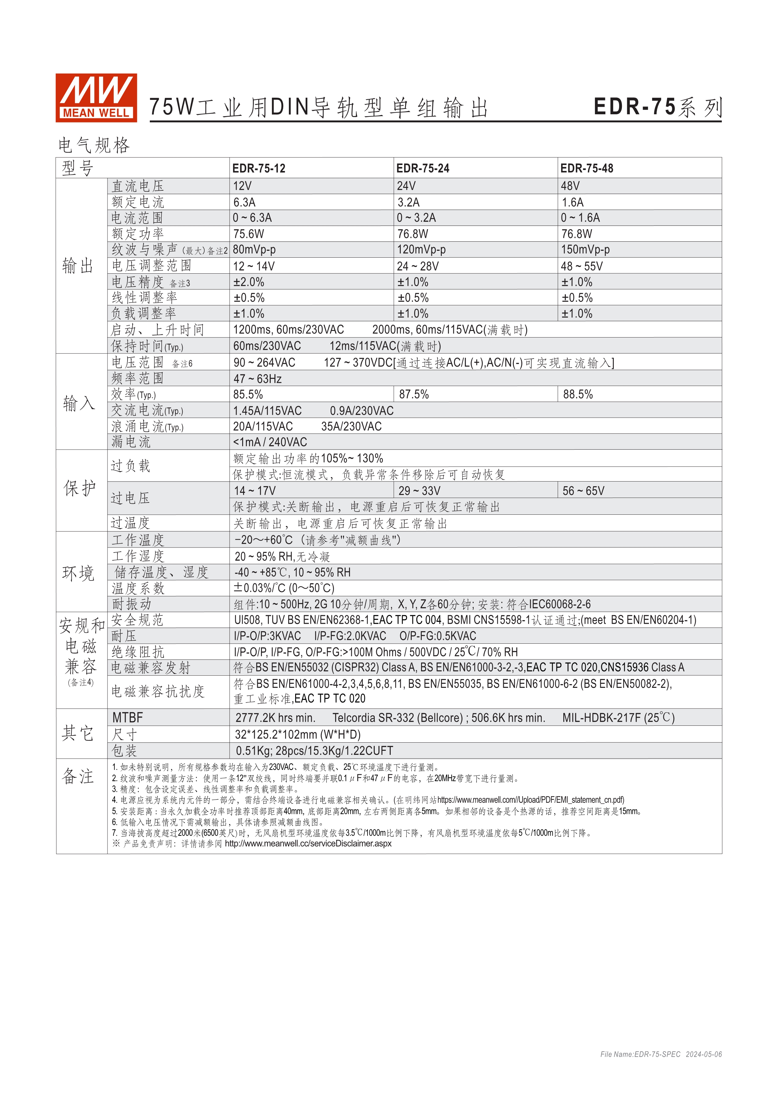 金屬殼,低價款 單相, 全范圍輸入 窄面寬設計:32~40mm EMC EN55022 class A 適合安裝于DIN rail TS-35 / 7.5或15 2年保固期