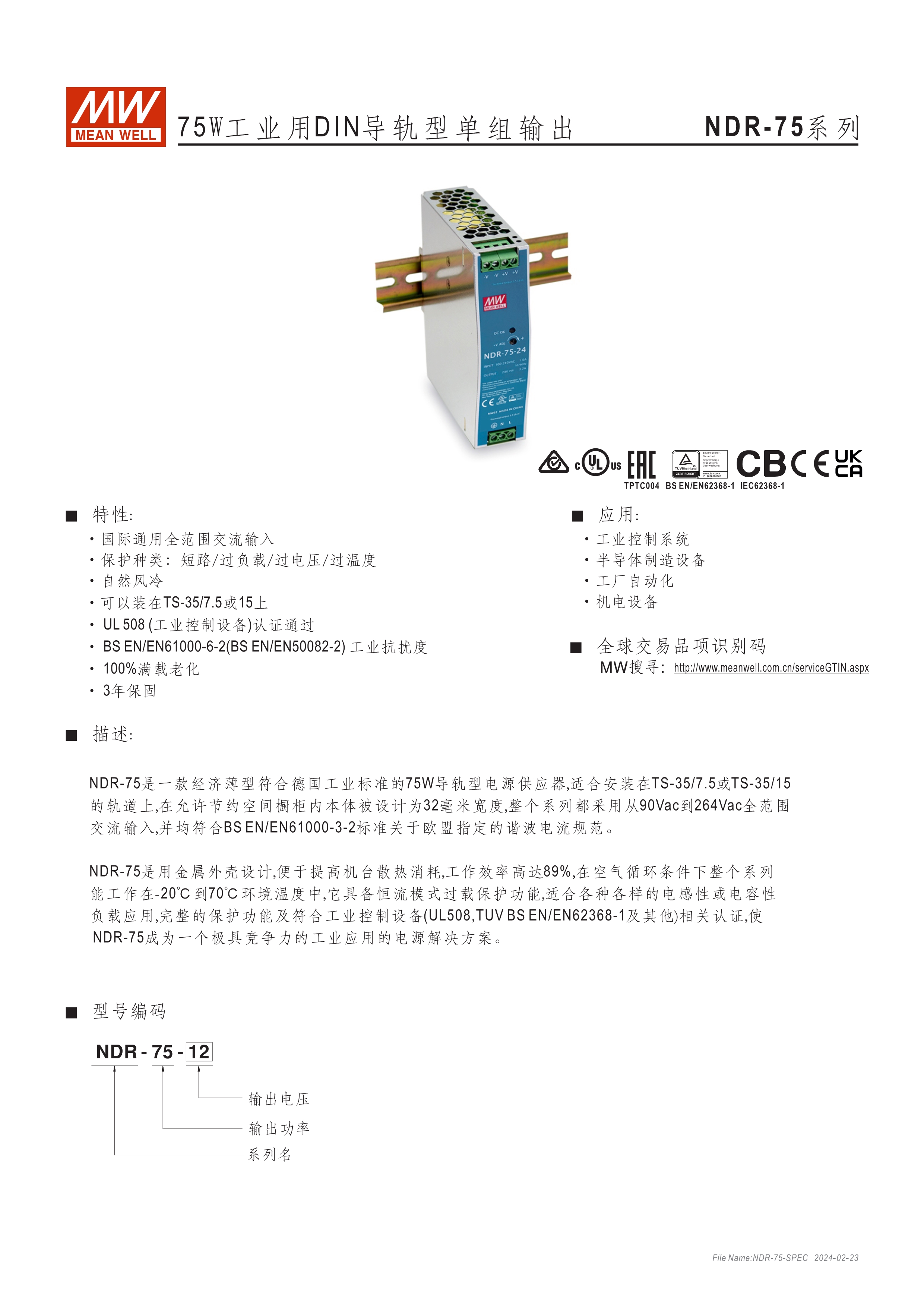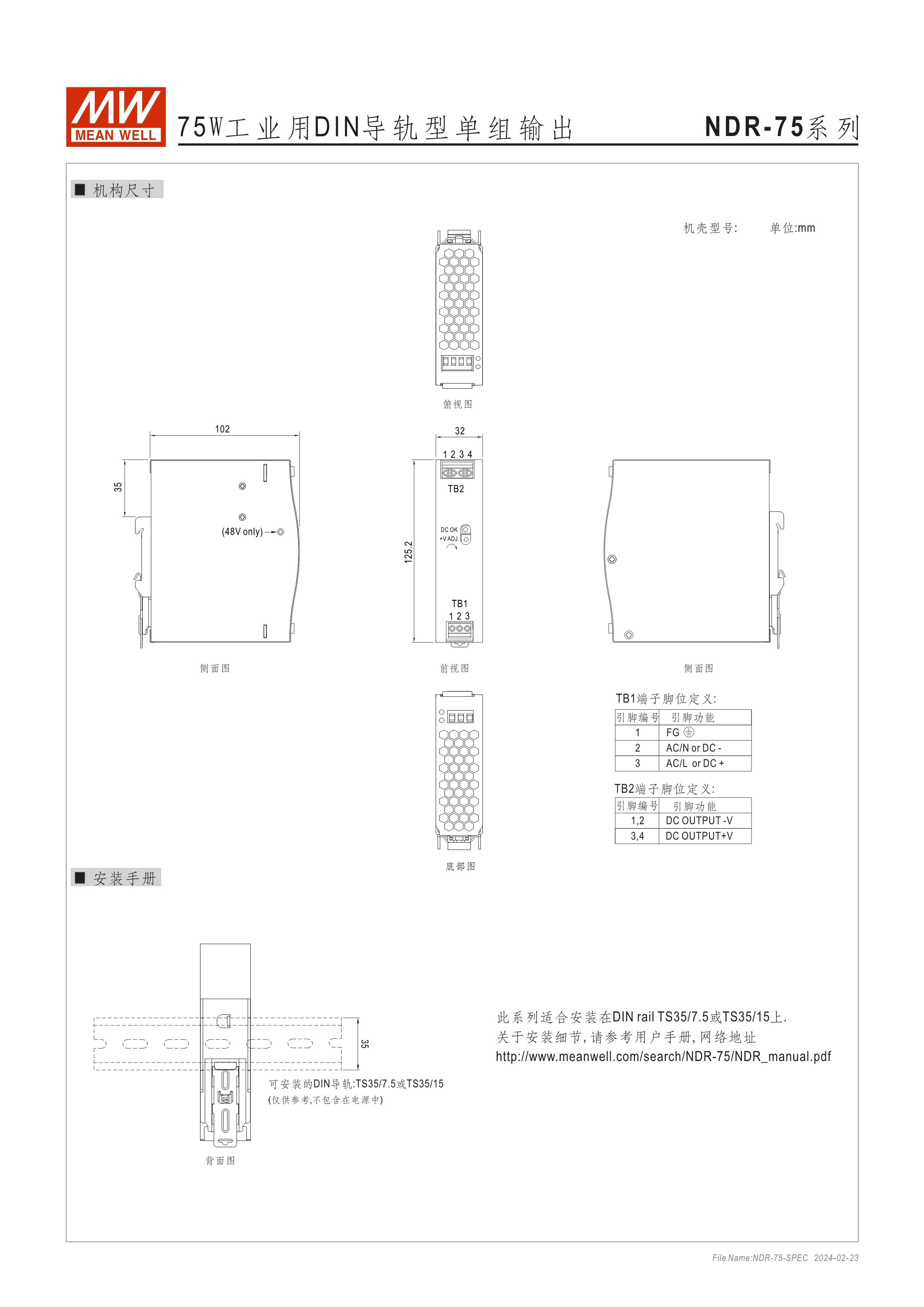 金屬殼,經(jīng)濟(jì)款 單相, 90~264Vac, 全范圍輸入 窄面寬設(shè)計(jì):32~85.5mm EMC EN55022 class B 適合安裝于DIN rail TS-35 / 7.5或15 3年保固期
