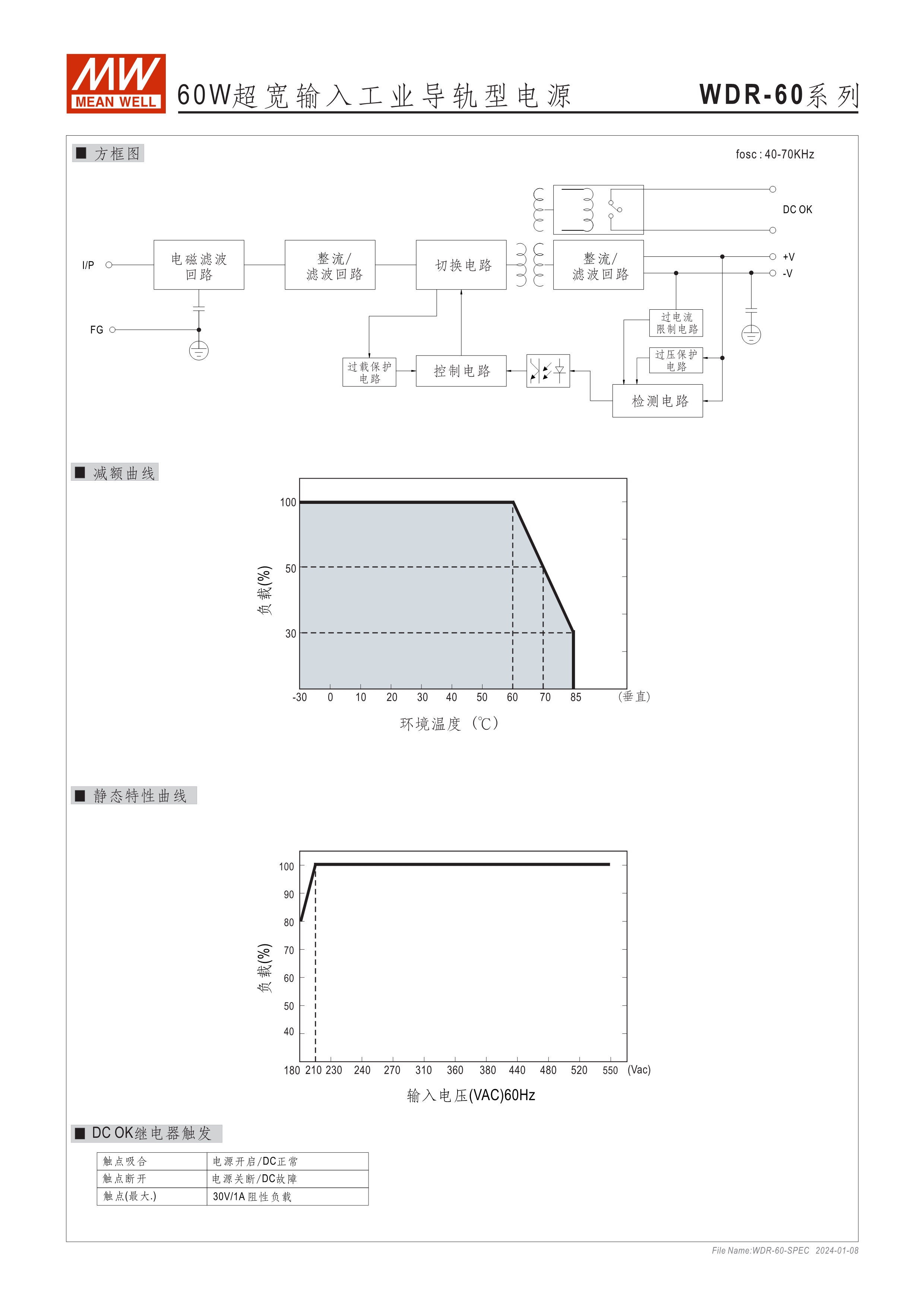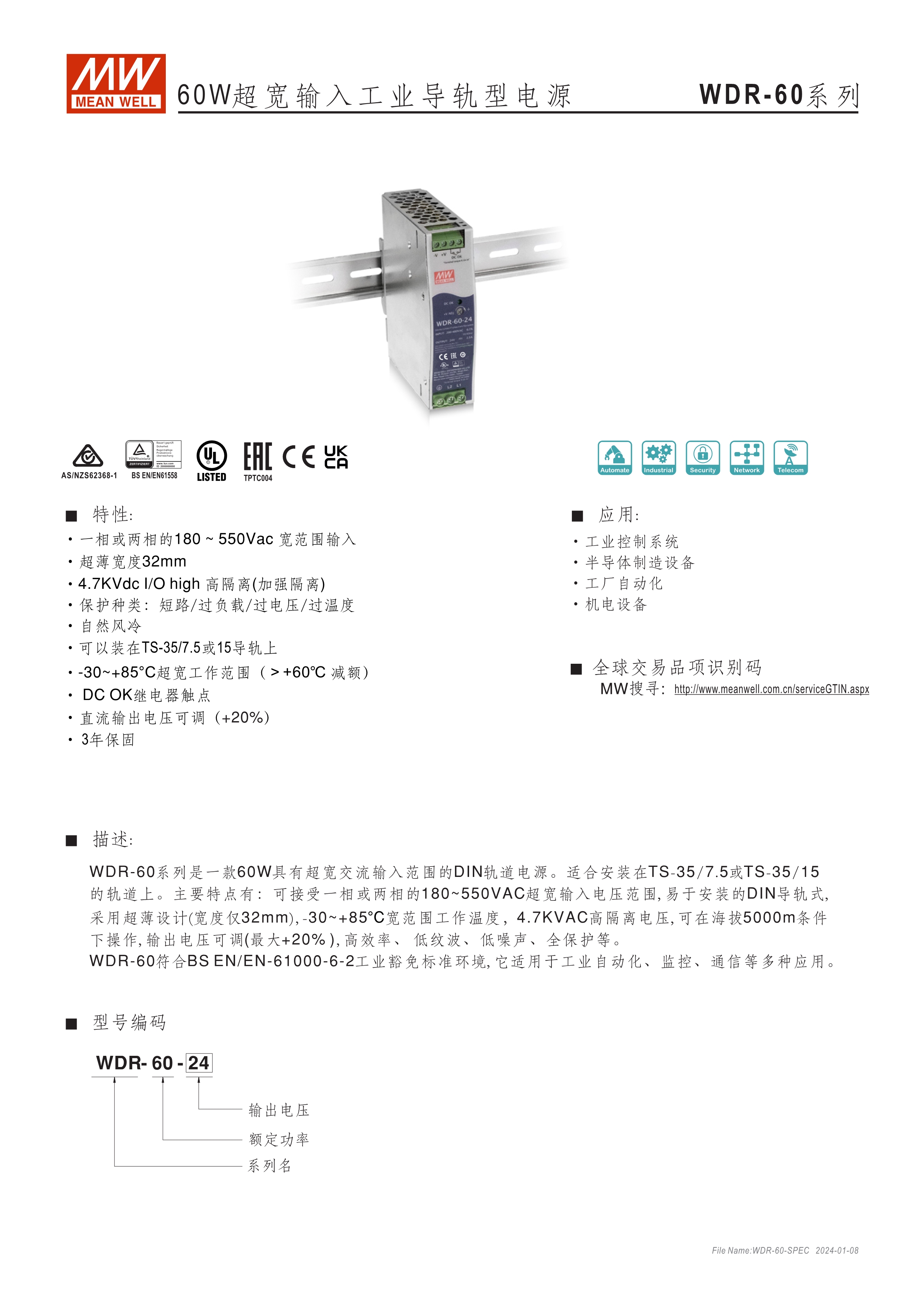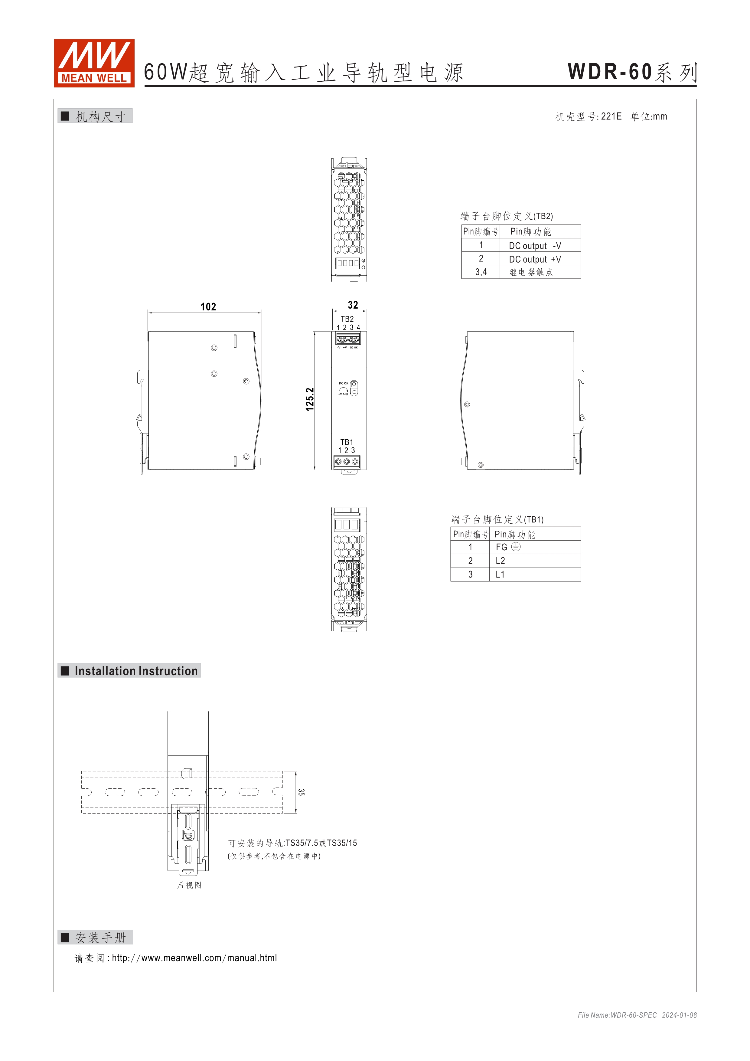 金屬殼,薄型設(shè)計 單相及雙相, 180~550VAC寬輸入范圍 高工作效率達(dá)93% 240W及480W內(nèi)建主動式功率因子矯正功能(active PFC) 適合安裝于DIN rail TS-35 / 7.5 或 15 內(nèi)建DC OK繼電器接點(Relay contact)