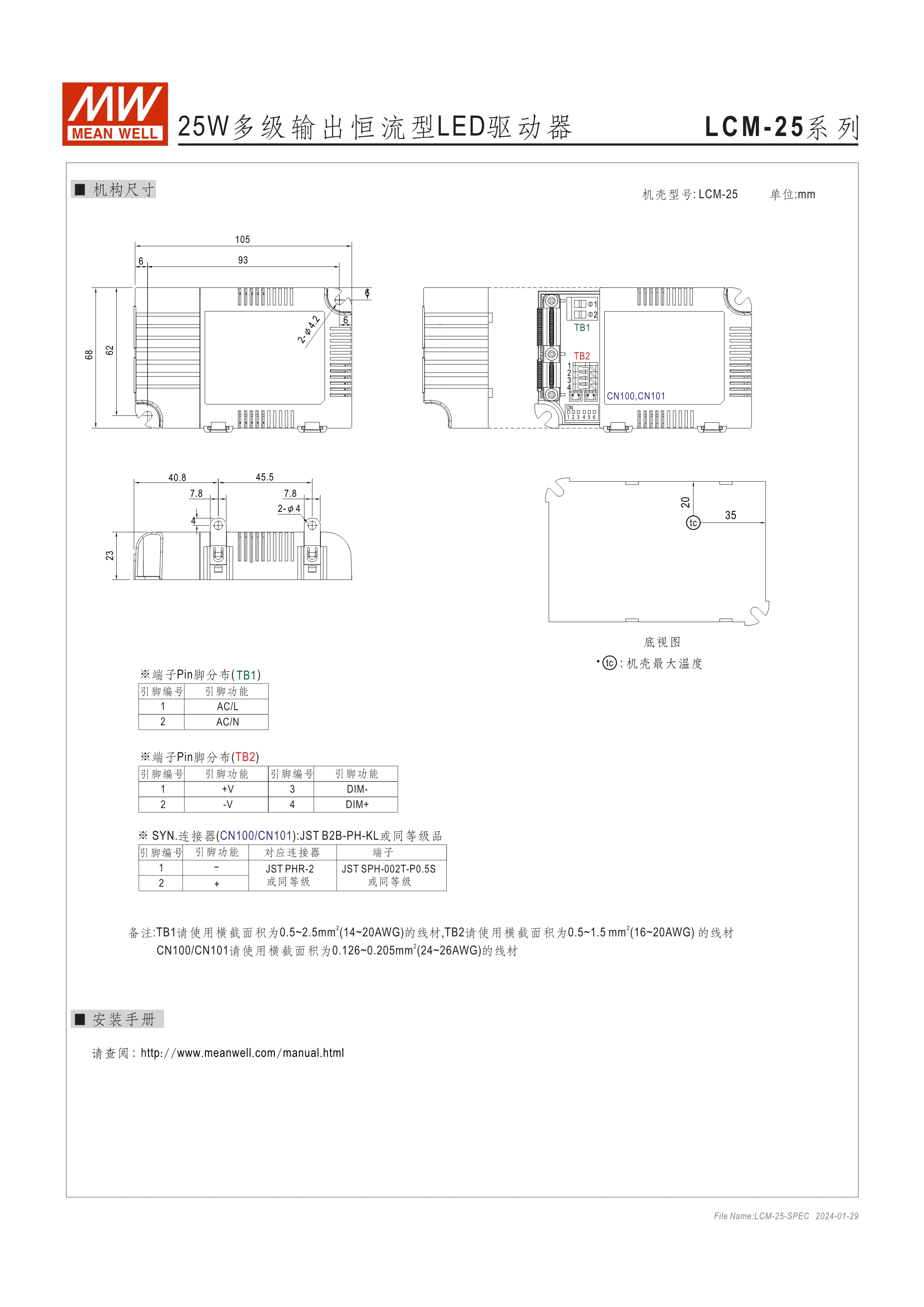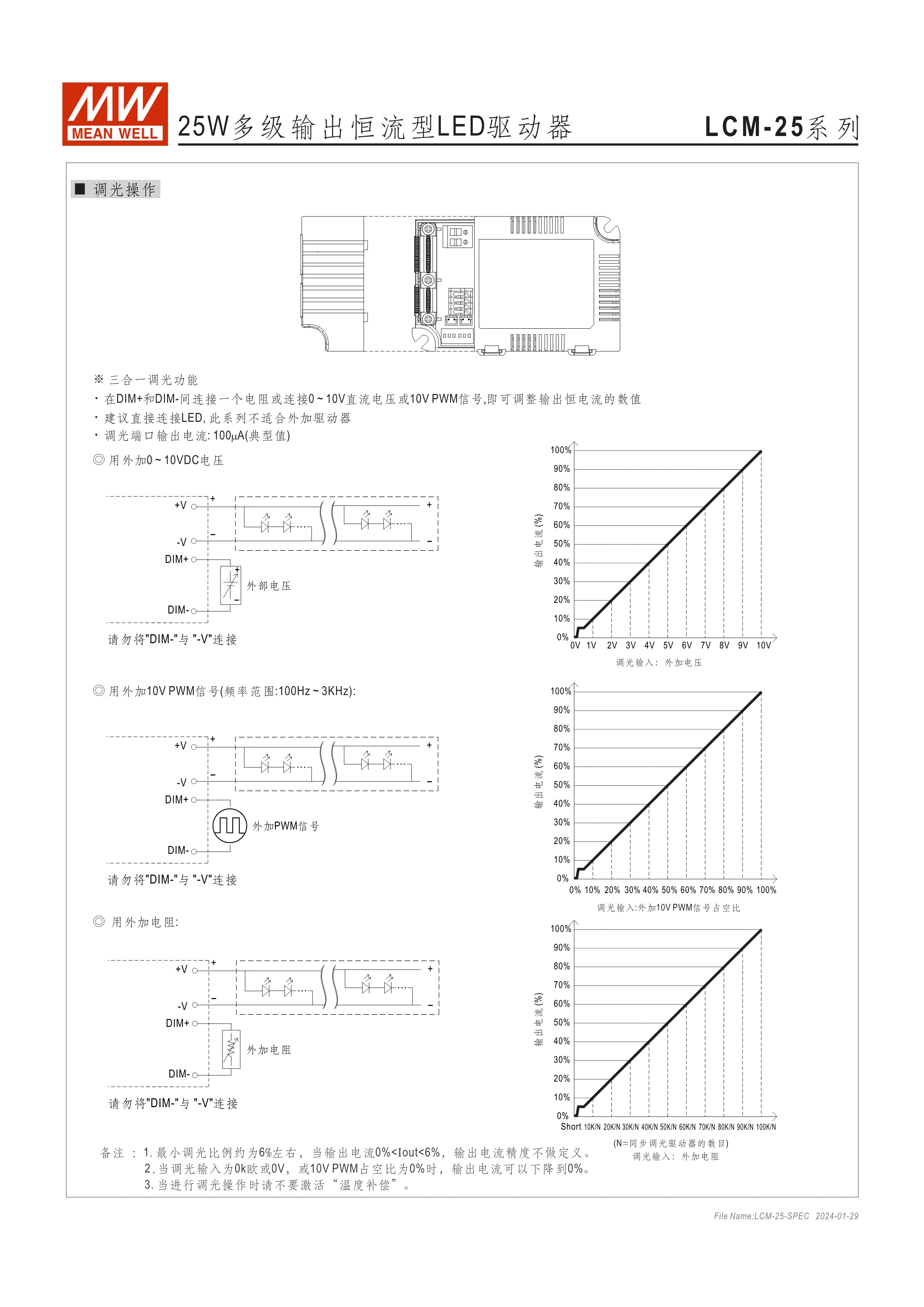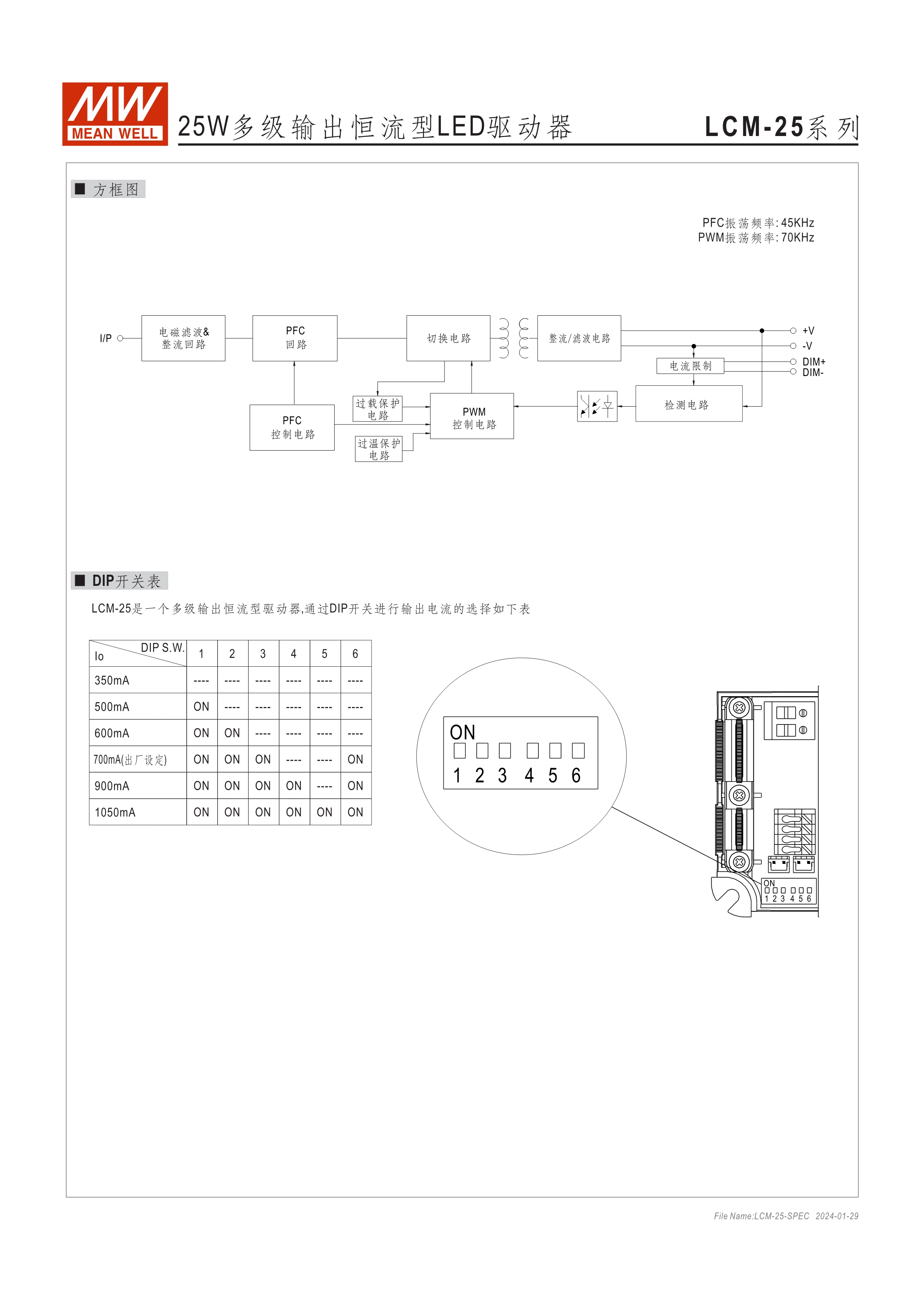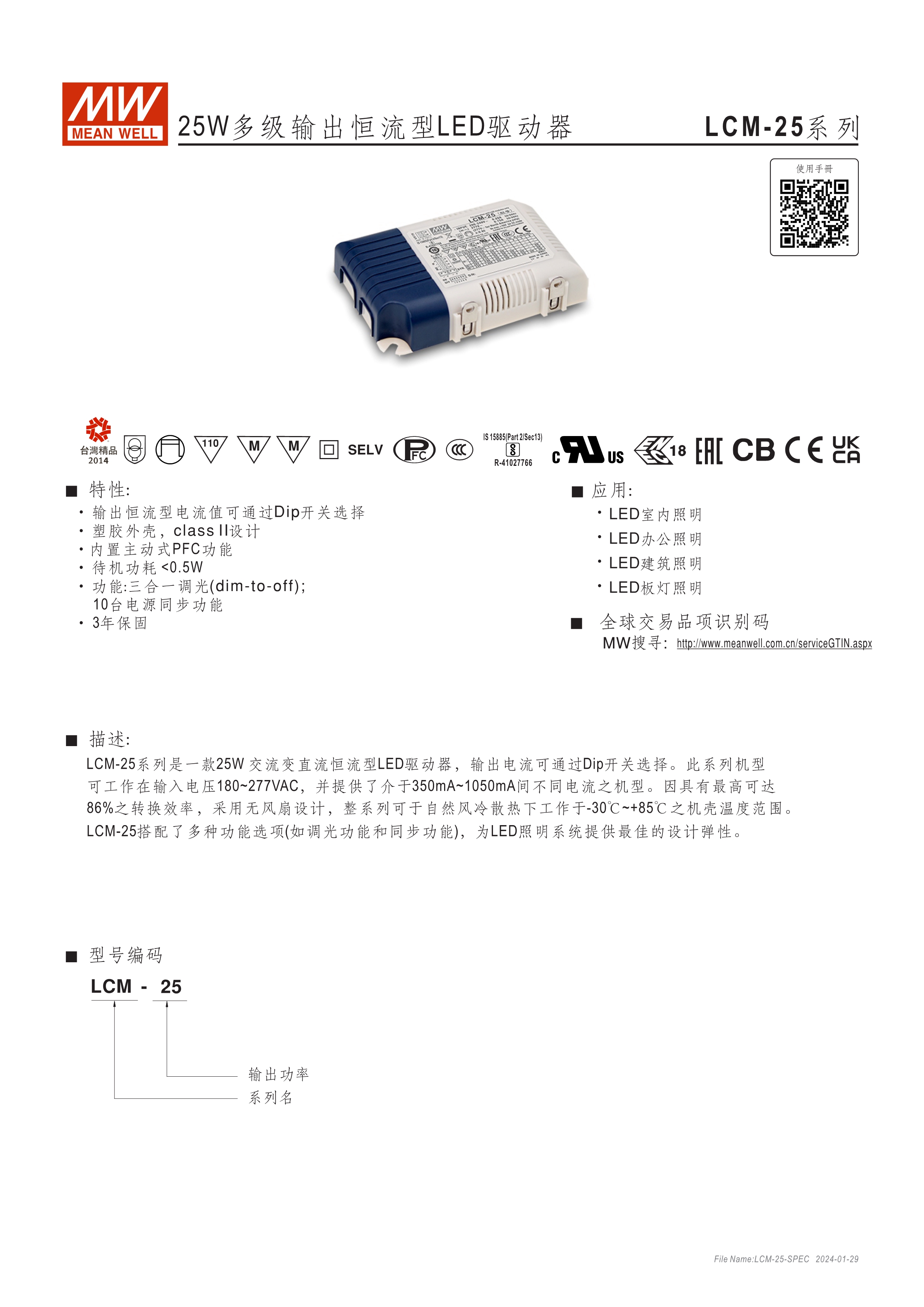LCM-25(DA):180~277VAC交流輸入, LCM-40(DA)/60(DA):180~295VAC交流輸入 內(nèi)建主動式功率因子矯正功能(active PFC) 塑料外殼 可透過指撥開關(guān)切換不同輸出電流檔位之多段式電源 LCM-25/40/60內(nèi)建三合一調(diào)光功能(0~10VDC, PWM信號或電阻,可關(guān)斷) LCM-25DA/40DA/60DA內(nèi)建DALI接口 和按鈕調(diào)光功能(Push Dim) LCM-40TW為2路輸出支持可溫(DT8)及調(diào)光(DT6)應(yīng)用 適合于LED室內(nèi)照明相關(guān)應(yīng)用