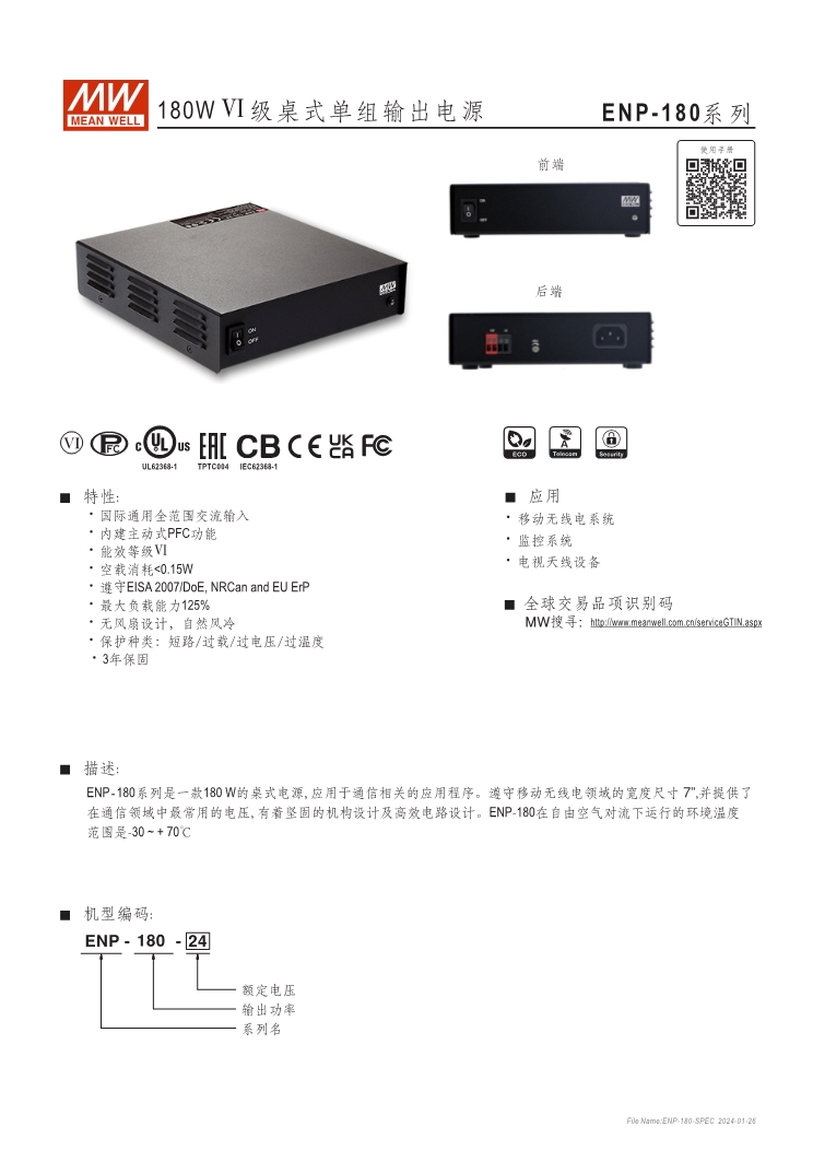 ENC:可編程充電器, ENP:Level VI電源供應(yīng)器 可透過(guò)SBP-001編程器設(shè)定充電電壓、電流、停充時(shí)間 NTC溫度補(bǔ)償功能 (ENC系列) 無(wú)風(fēng)扇設(shè)計(jì)、靜音 保護(hù)功能:短路、過(guò)壓、過(guò)溫度保護(hù)(ENC/ENP系列); 電池過(guò)低、過(guò)高、極性反接(僅ENC系列) 適用于鉛酸電池 3年保固