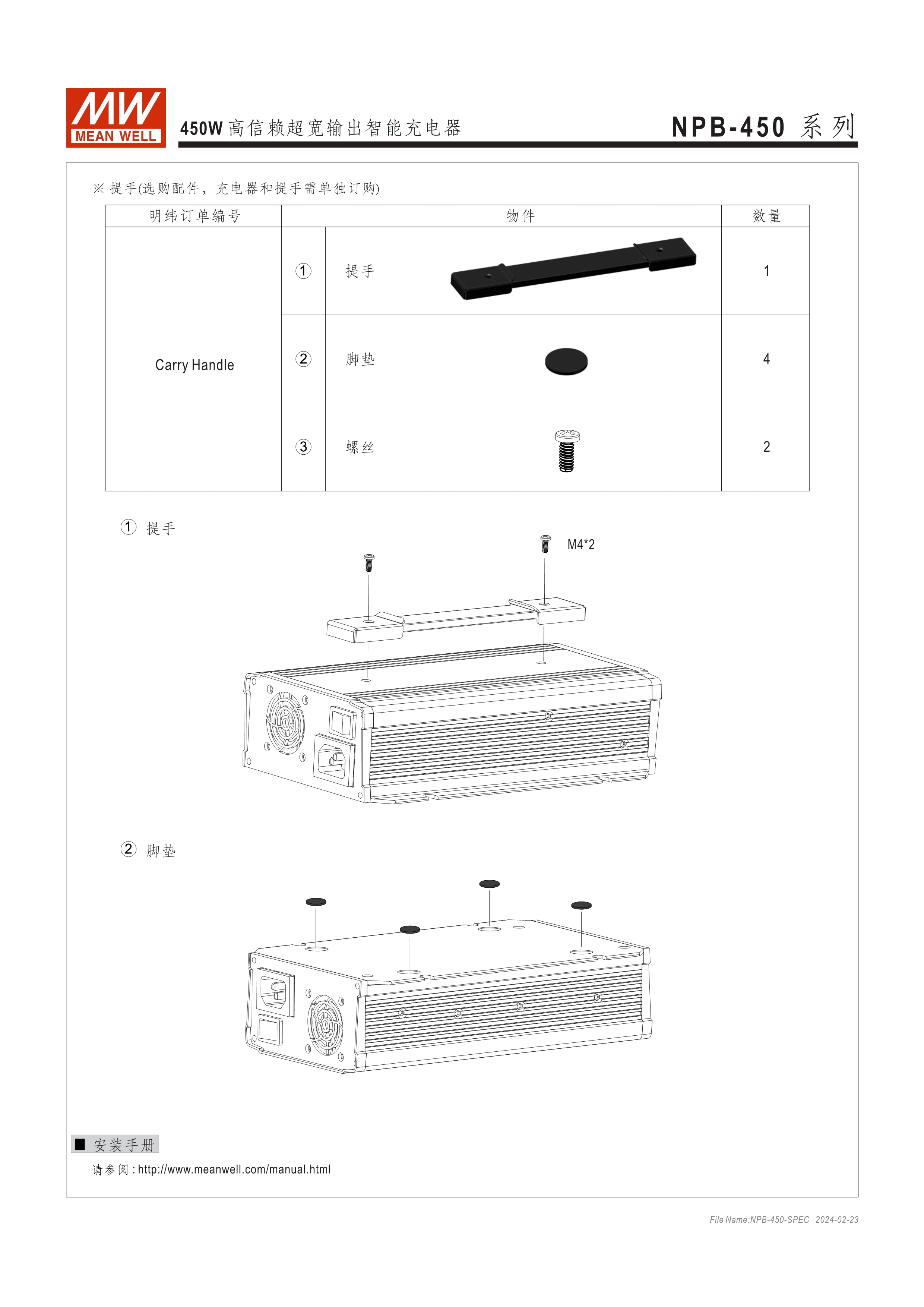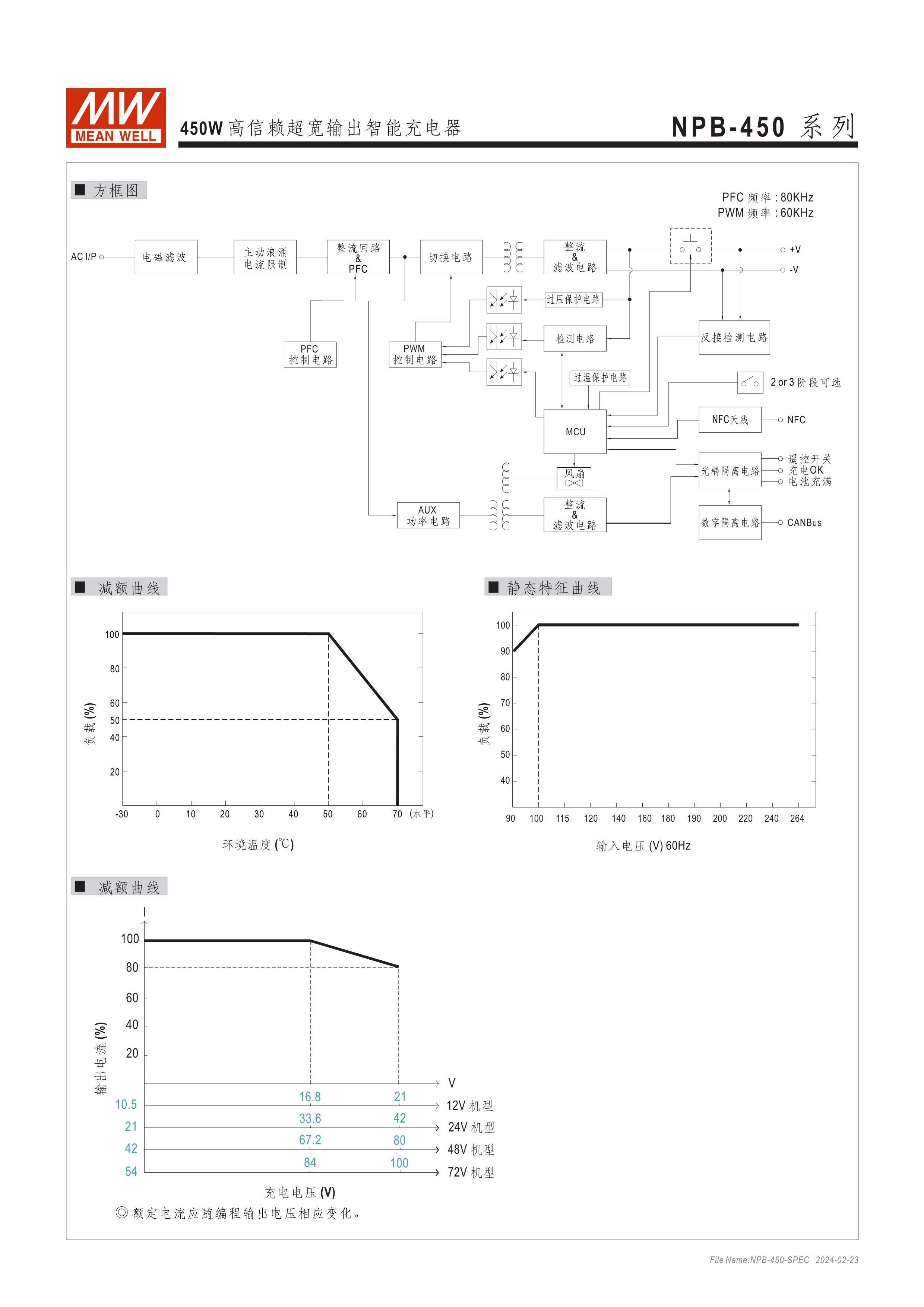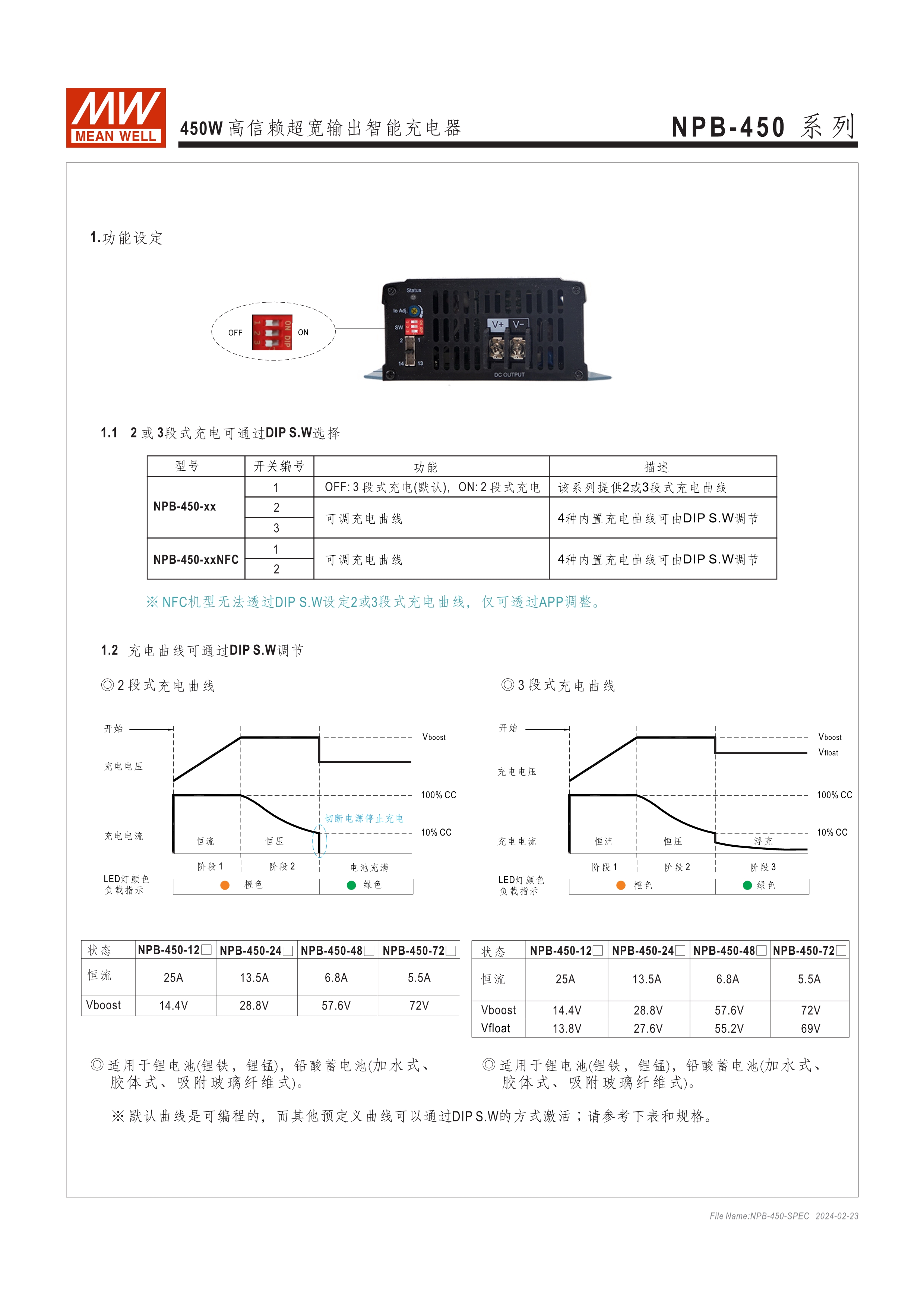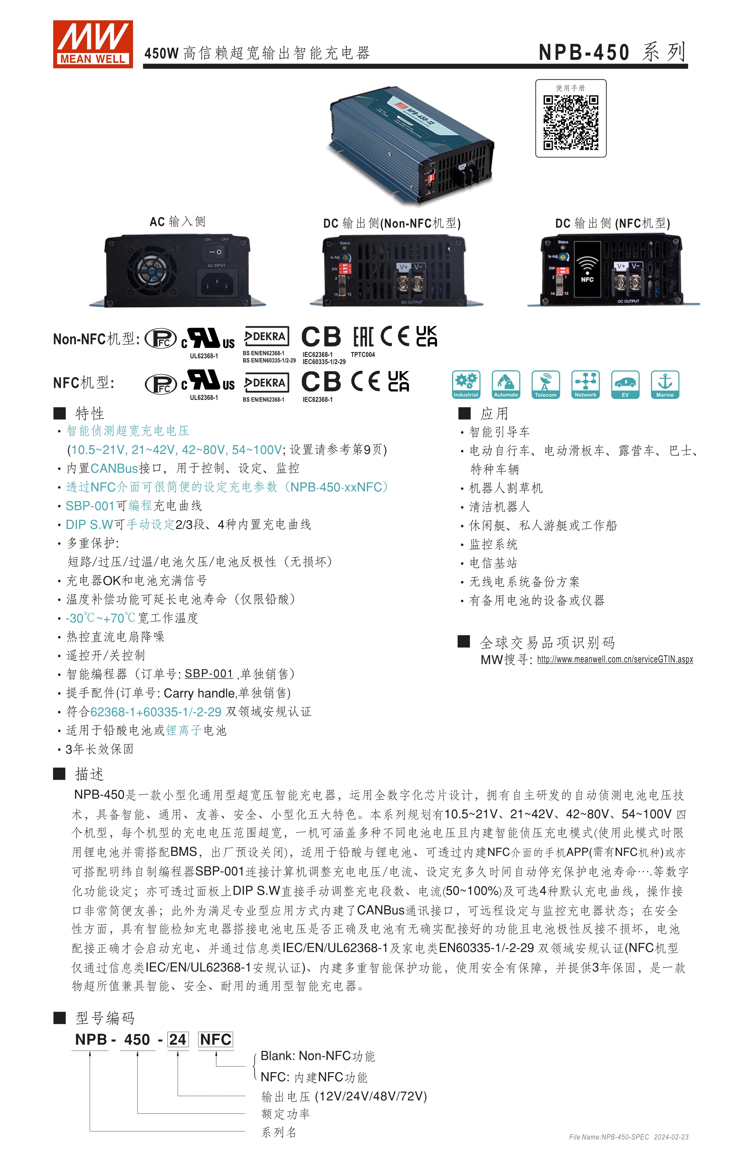 NPB系列:通用型超寬壓智能充電器 超寬壓自動(dòng)偵壓充電 [10.5~21V, 21~42V, 42~80V, 54~100V(僅NPB-450)] 內(nèi)建CANBus通訊介面 搭配SBP-001編程器,可設(shè)定充電電壓、電流、2段或3段、停充時(shí)間 可調(diào)充電電流 (由面板VR調(diào)整50~100%) 透過面板DIP Switch可微調(diào)4種預(yù)設(shè)充電曲線 透過面板DIP Switch可調(diào)2段或3段充電 NTC溫度補(bǔ)償功能 采低噪音溫控風(fēng)扇 過溫度自動(dòng)降載充電 -30~+70oC寬溫度,使用環(huán)境受限少 通過UL/EN62368-1、IEC/EN62368-1/-2-29雙安規(guī)認(rèn)證 適用鉛酸電池、鋰電池 可另購(gòu)手提把手 (Order No.: Carry Handle) 3年保固