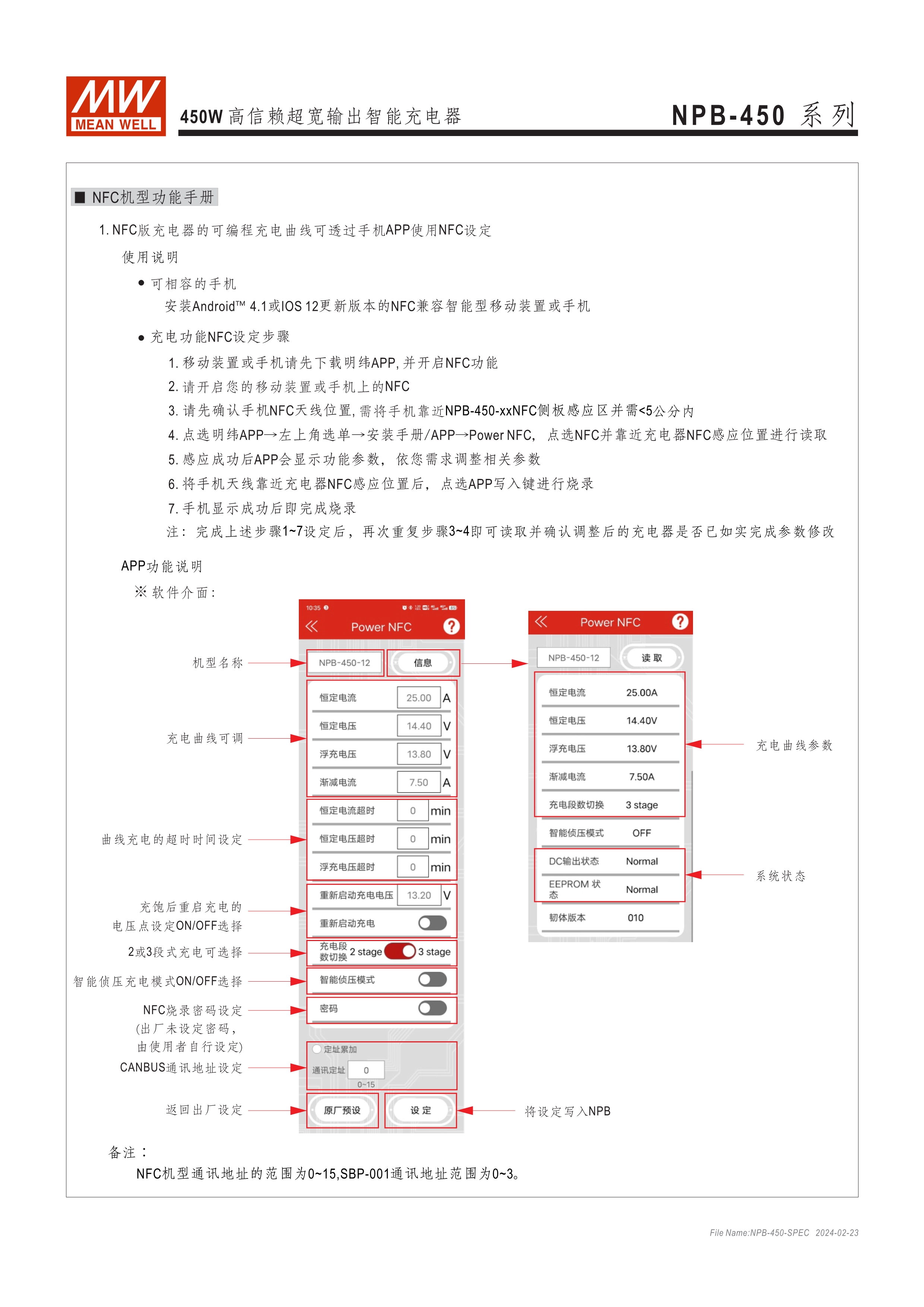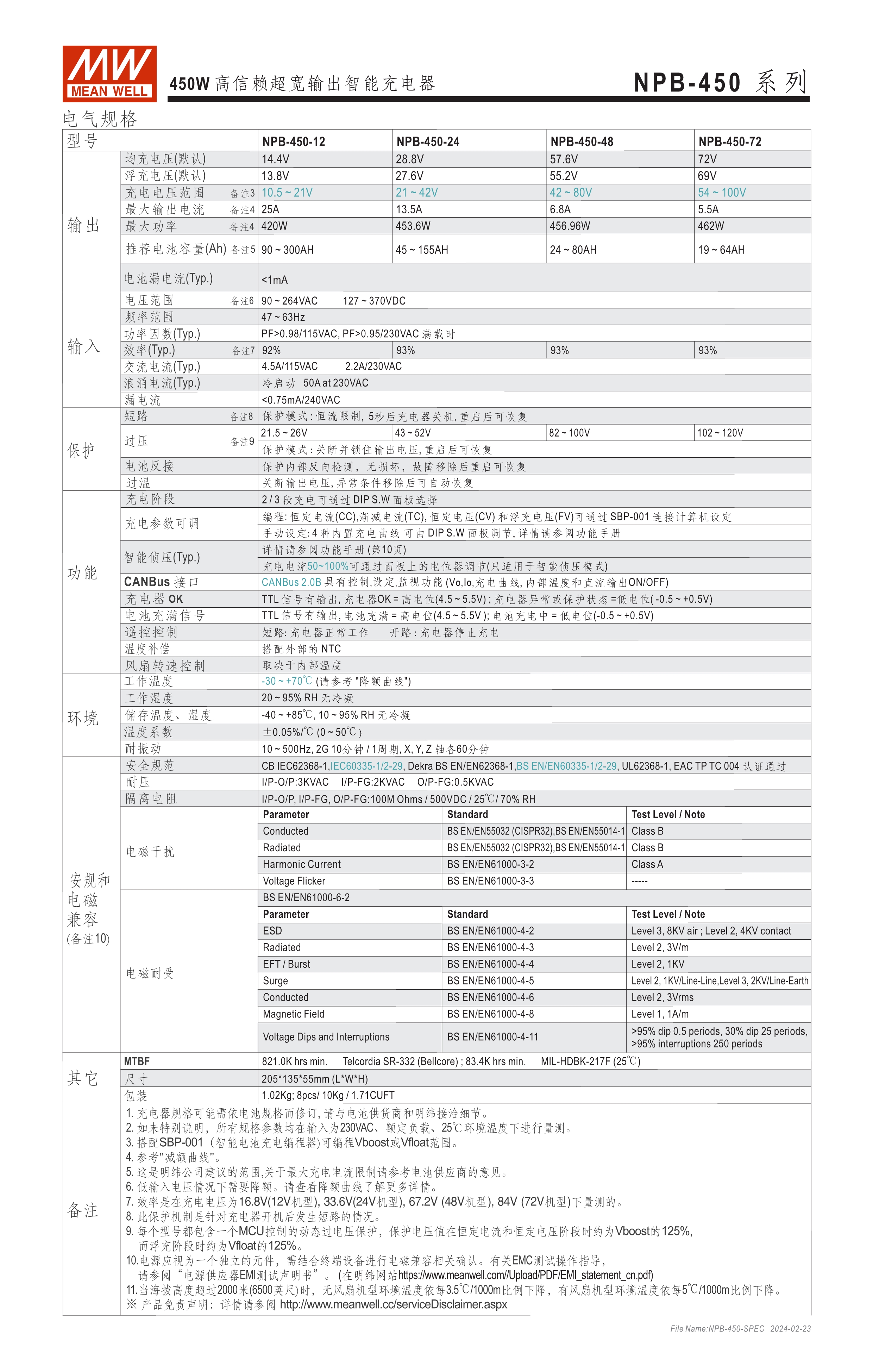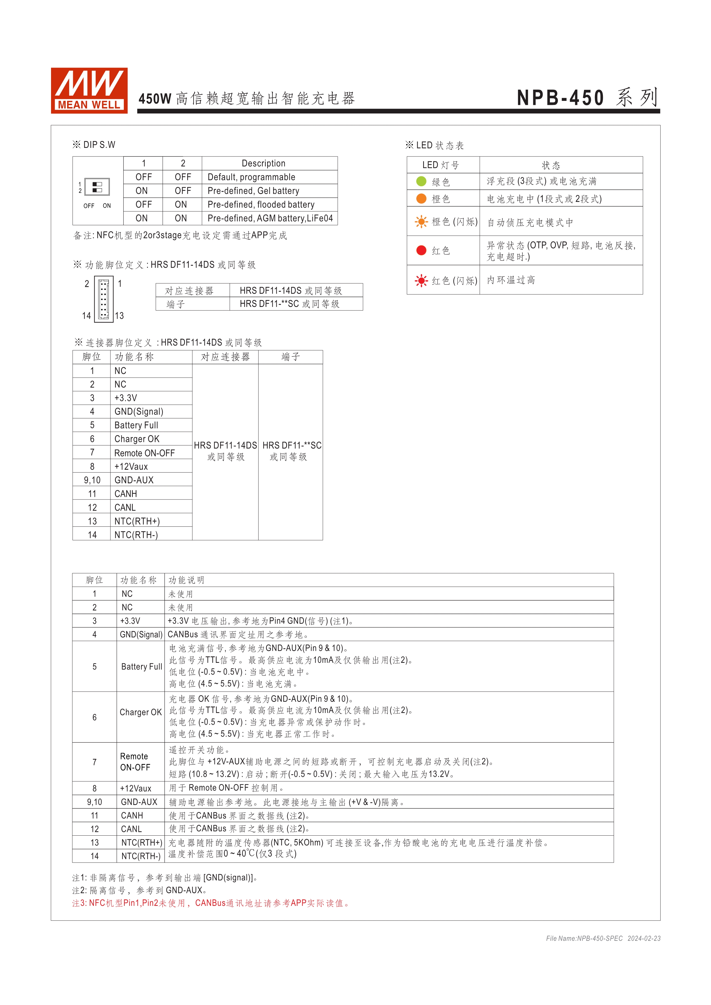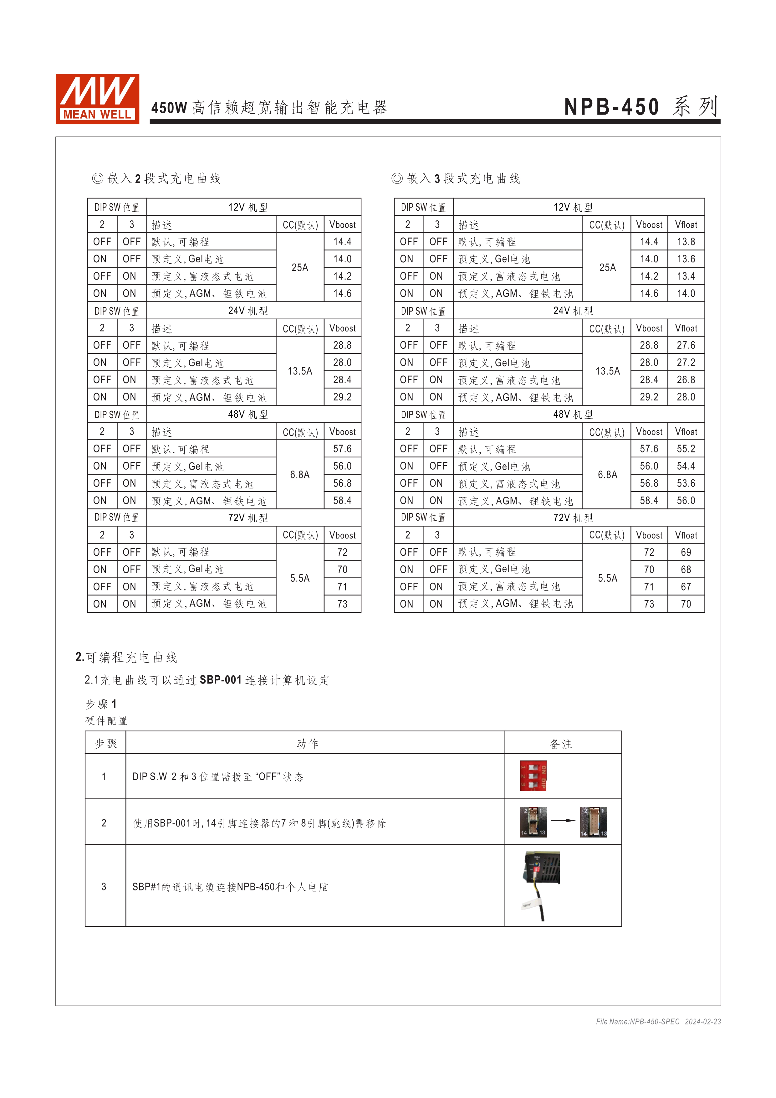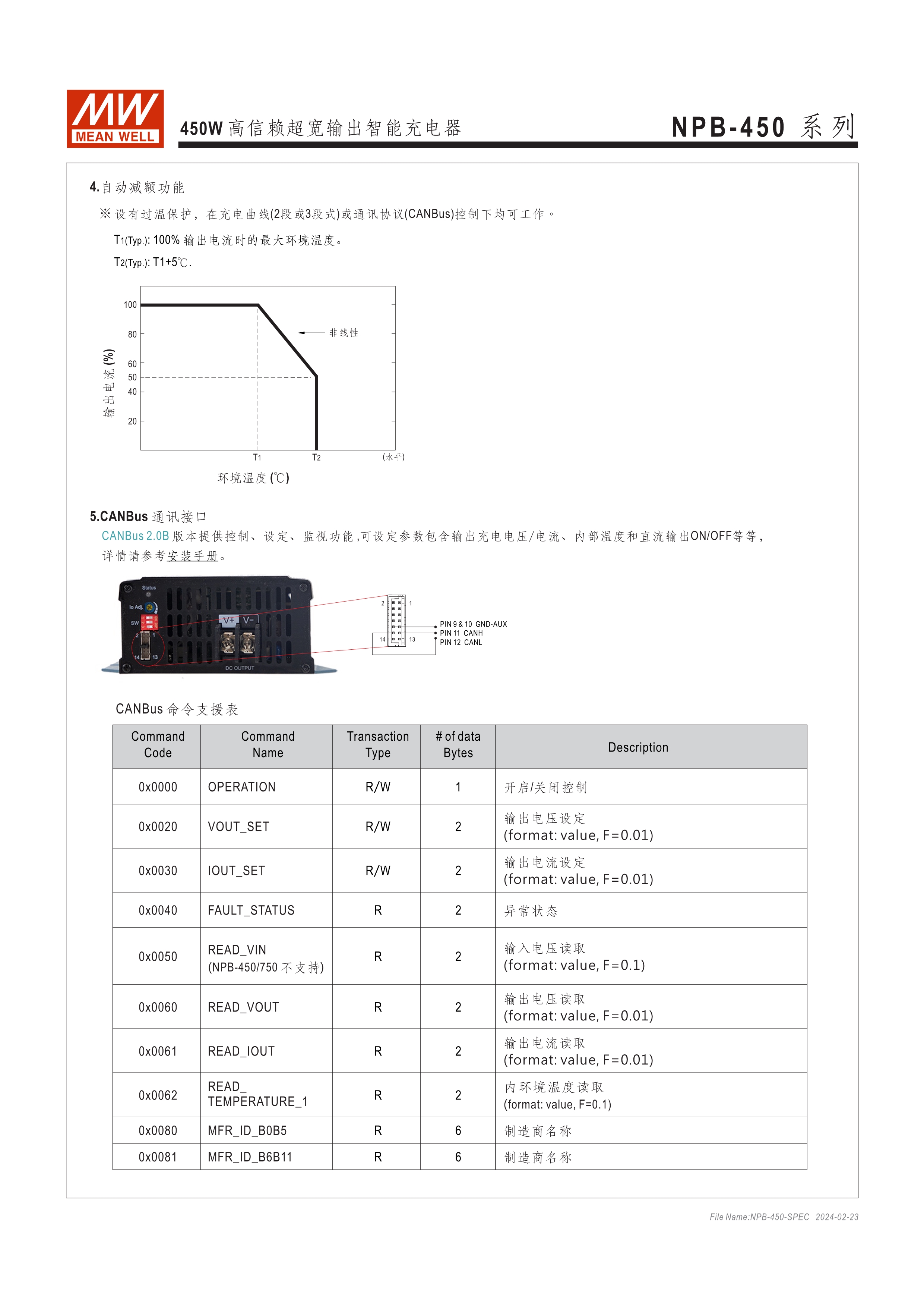 NPB系列:通用型超寬壓智能充電器 超寬壓自動(dòng)偵壓充電 [10.5~21V, 21~42V, 42~80V, 54~100V(僅NPB-450)] 內(nèi)建CANBus通訊介面 搭配SBP-001編程器,可設(shè)定充電電壓、電流、2段或3段、停充時(shí)間 可調(diào)充電電流 (由面板VR調(diào)整50~100%) 透過面板DIP Switch可微調(diào)4種預(yù)設(shè)充電曲線 透過面板DIP Switch可調(diào)2段或3段充電 NTC溫度補(bǔ)償功能 采低噪音溫控風(fēng)扇 過溫度自動(dòng)降載充電 -30~+70oC寬溫度,使用環(huán)境受限少 通過UL/EN62368-1、IEC/EN62368-1/-2-29雙安規(guī)認(rèn)證 適用鉛酸電池、鋰電池 可另購(gòu)手提把手 (Order No.: Carry Handle) 3年保固