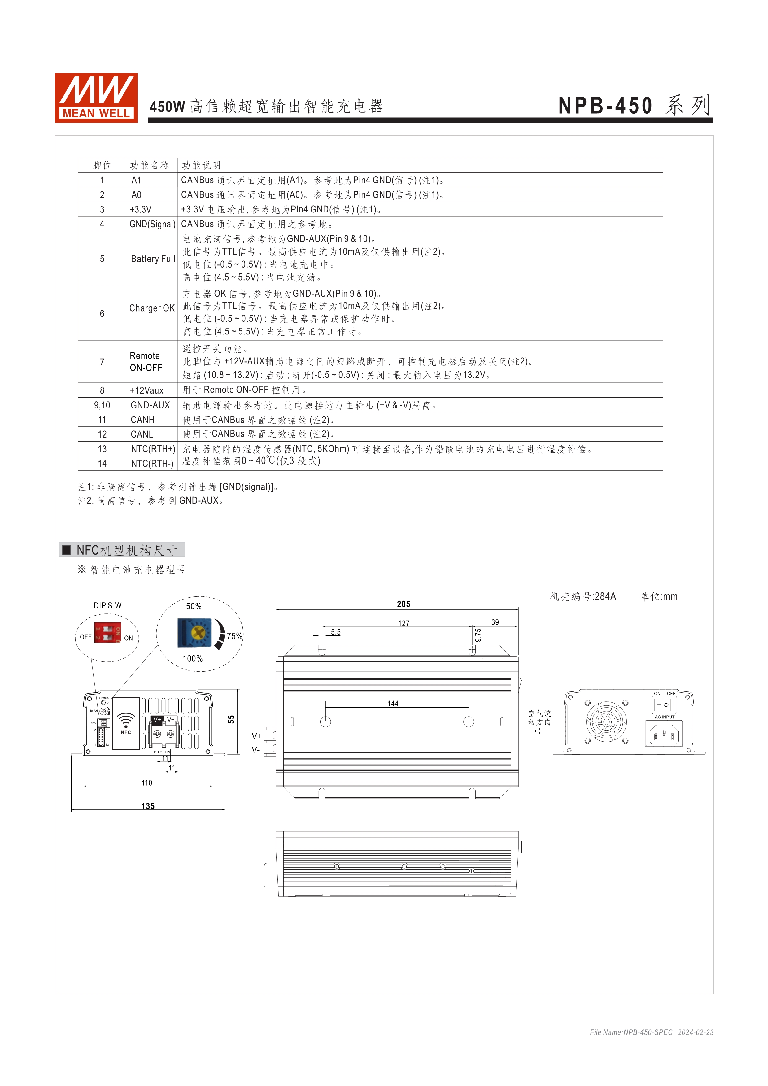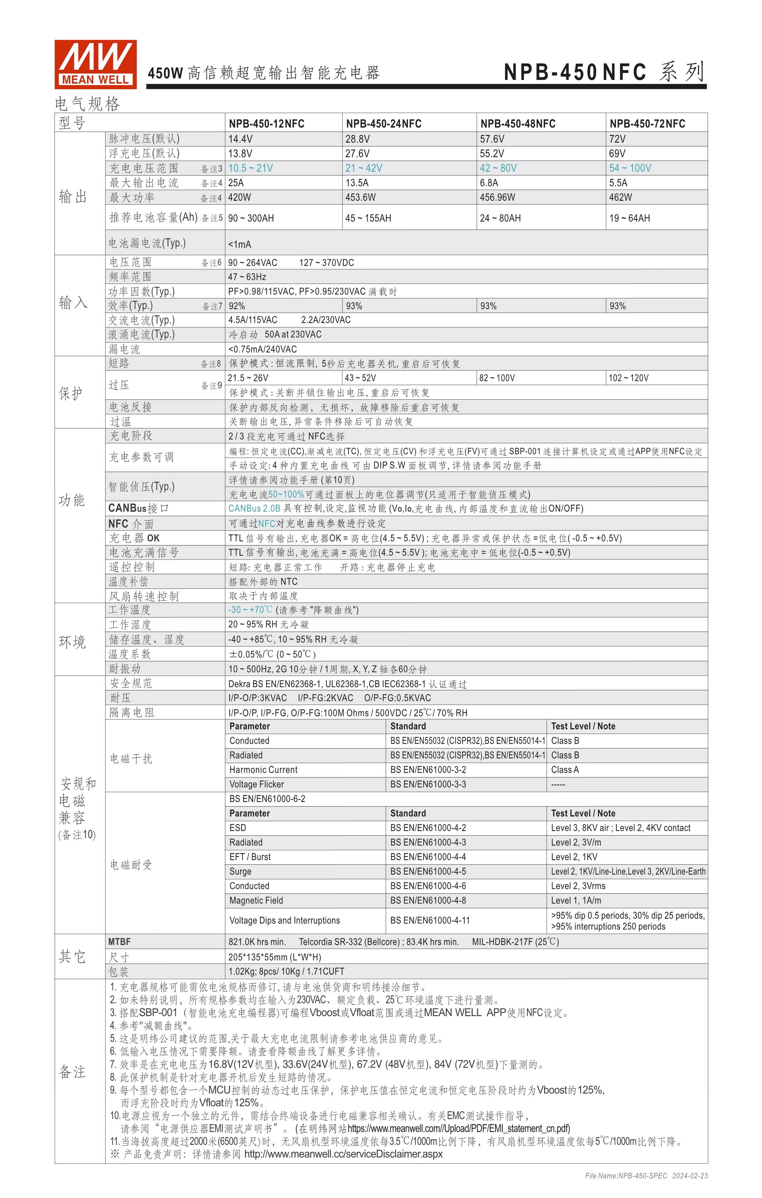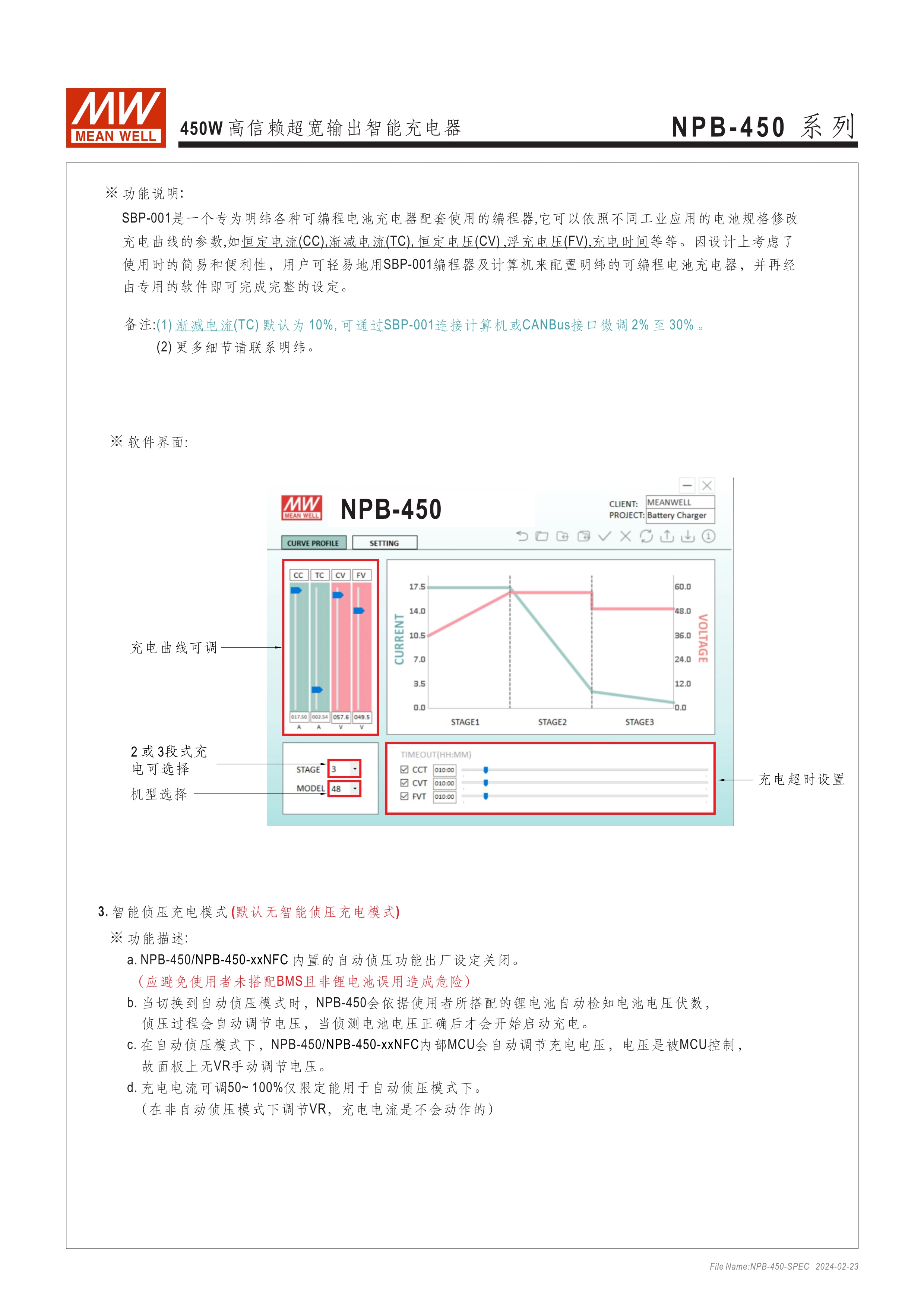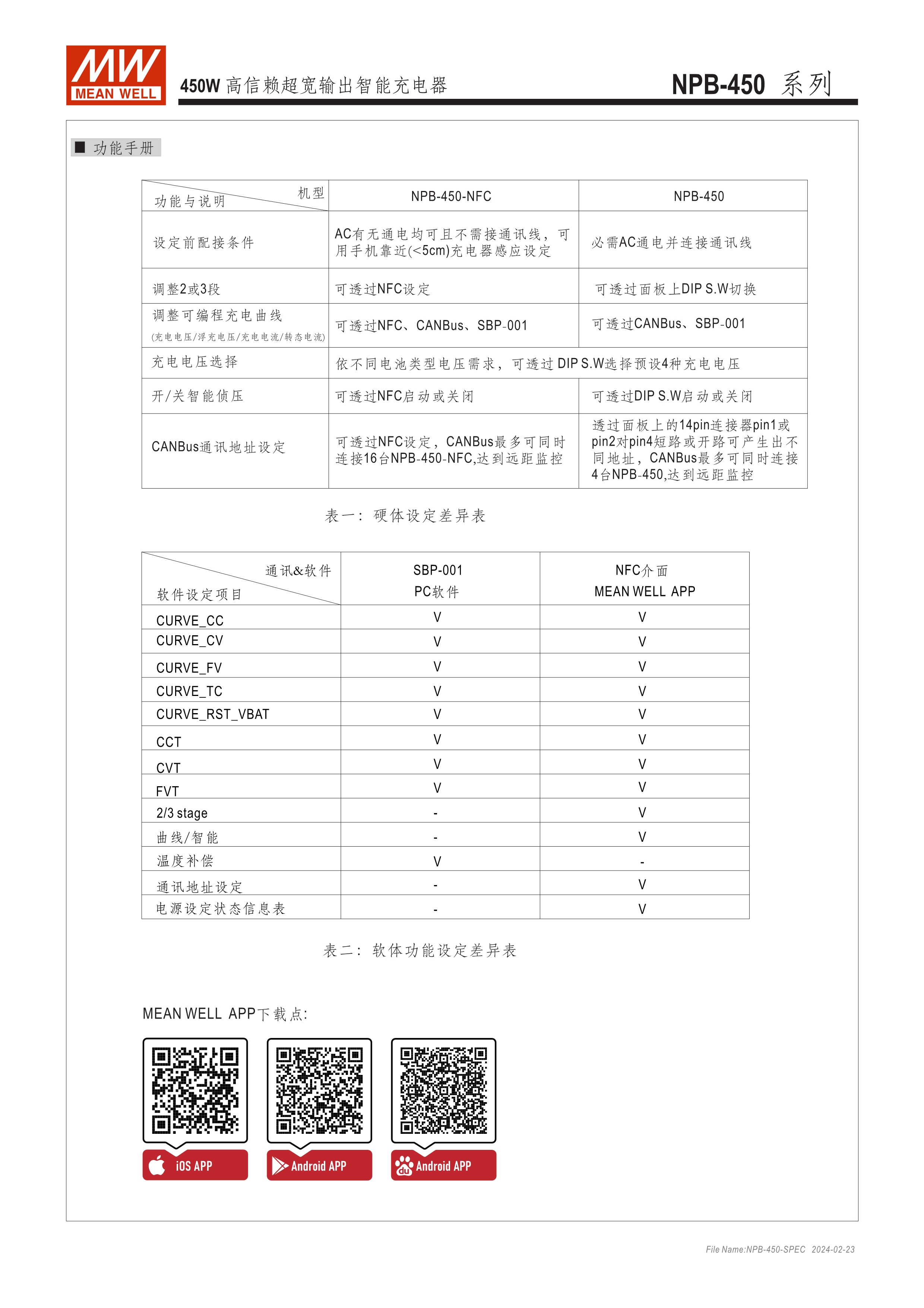 NPB系列:通用型超寬壓智能充電器 超寬壓自動(dòng)偵壓充電 [10.5~21V, 21~42V, 42~80V, 54~100V(僅NPB-450)] 內(nèi)建CANBus通訊介面 搭配SBP-001編程器,可設(shè)定充電電壓、電流、2段或3段、停充時(shí)間 可調(diào)充電電流 (由面板VR調(diào)整50~100%) 透過面板DIP Switch可微調(diào)4種預(yù)設(shè)充電曲線 透過面板DIP Switch可調(diào)2段或3段充電 NTC溫度補(bǔ)償功能 采低噪音溫控風(fēng)扇 過溫度自動(dòng)降載充電 -30~+70oC寬溫度,使用環(huán)境受限少 通過UL/EN62368-1、IEC/EN62368-1/-2-29雙安規(guī)認(rèn)證 適用鉛酸電池、鋰電池 可另購(gòu)手提把手 (Order No.: Carry Handle) 3年保固