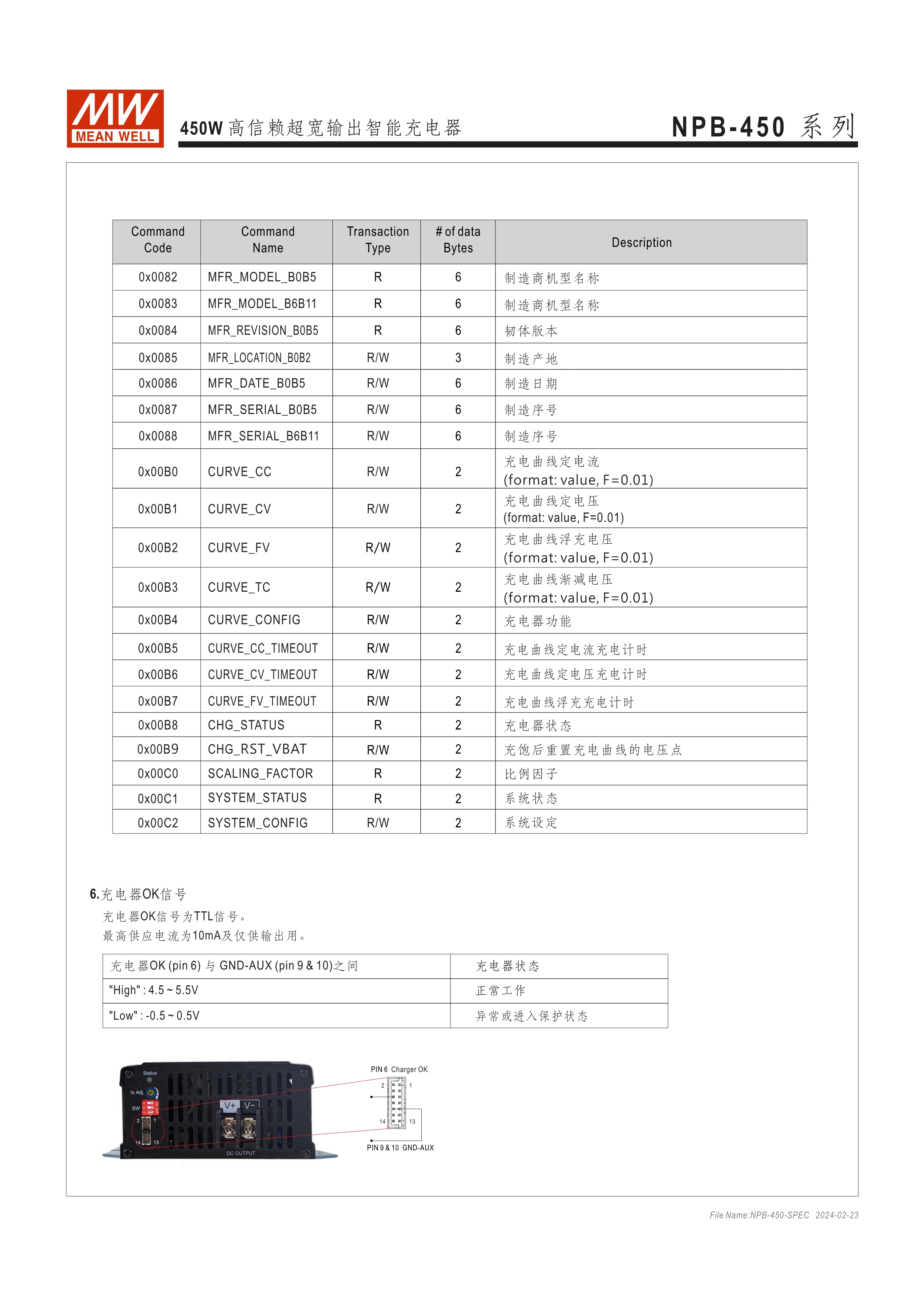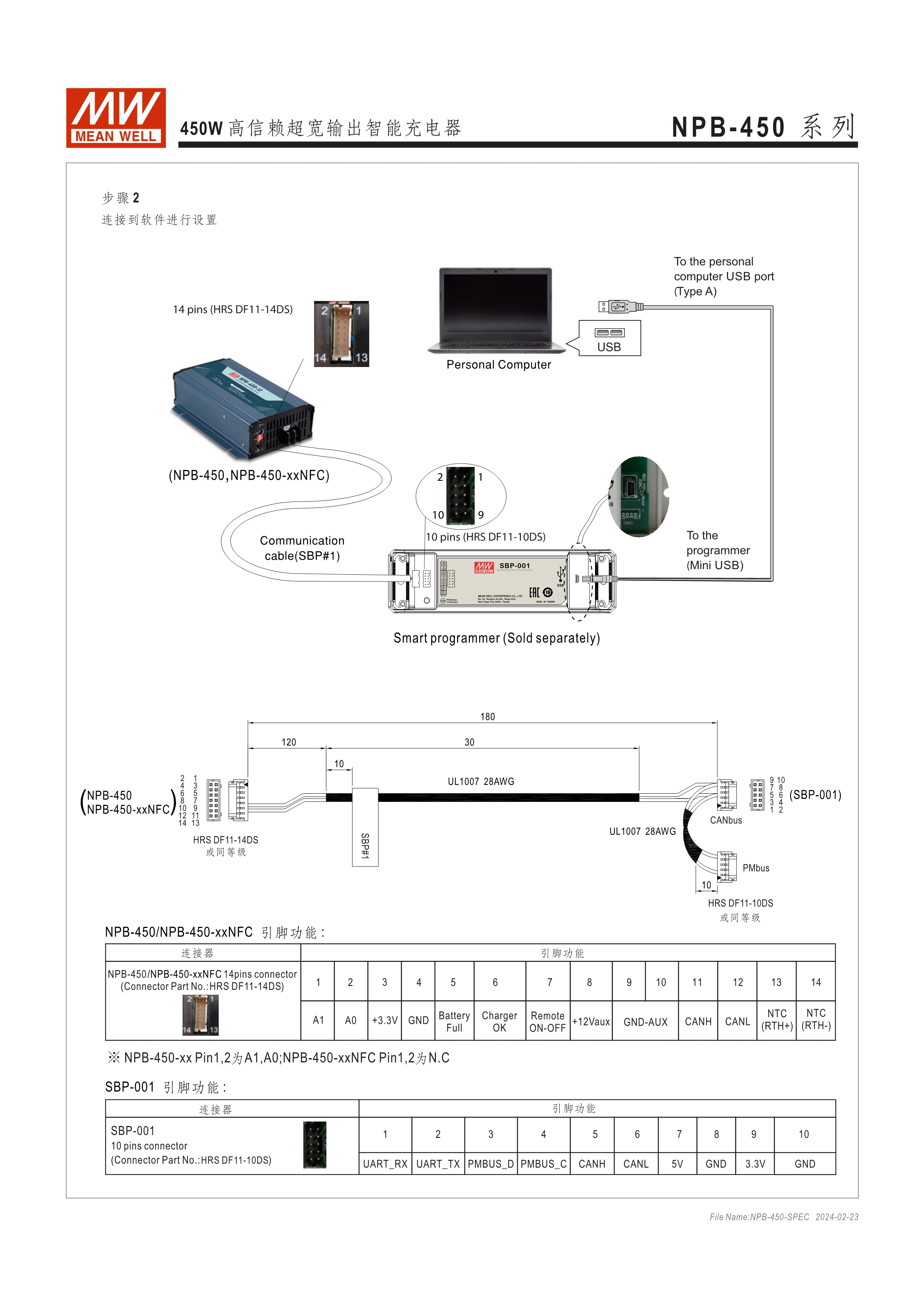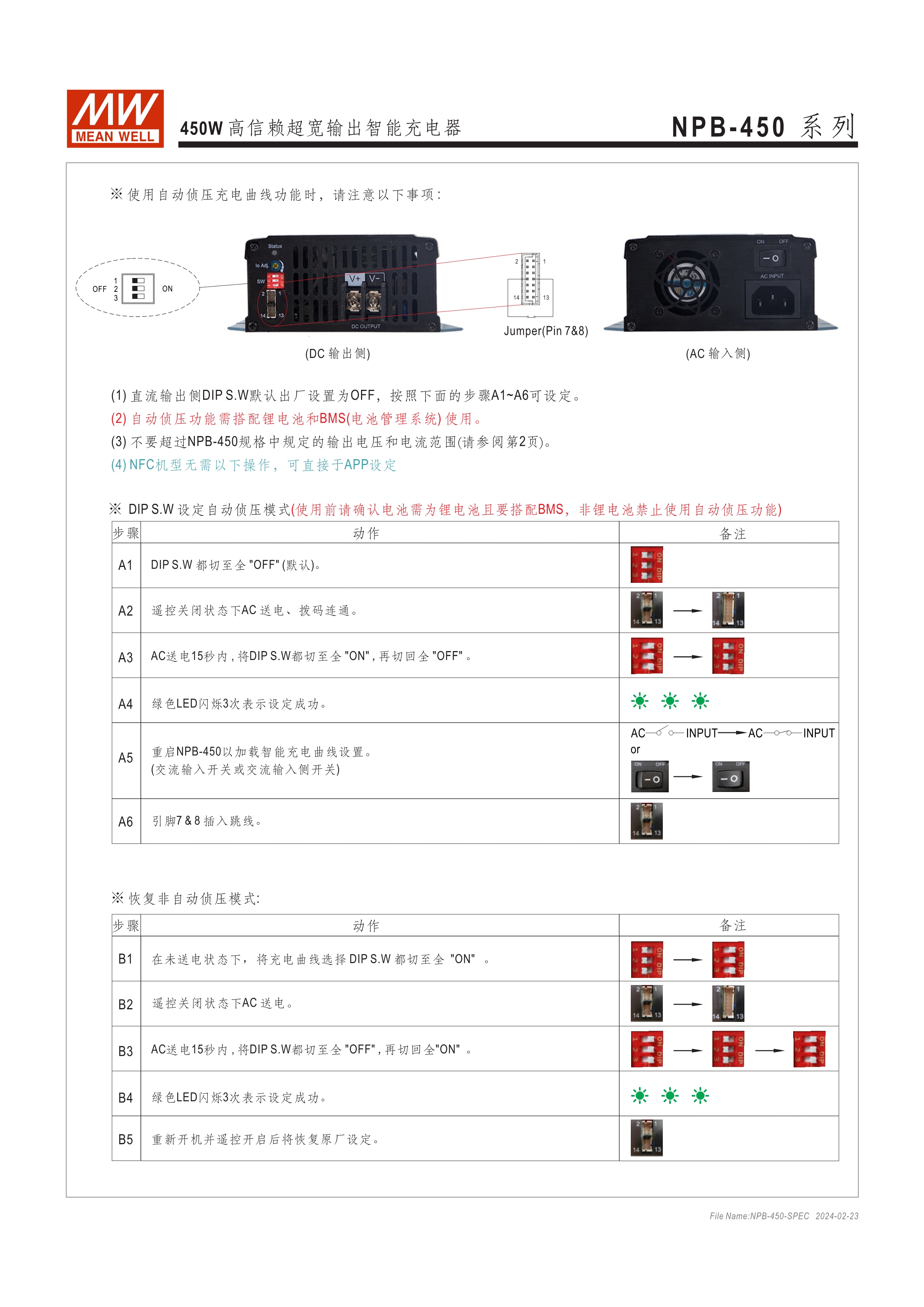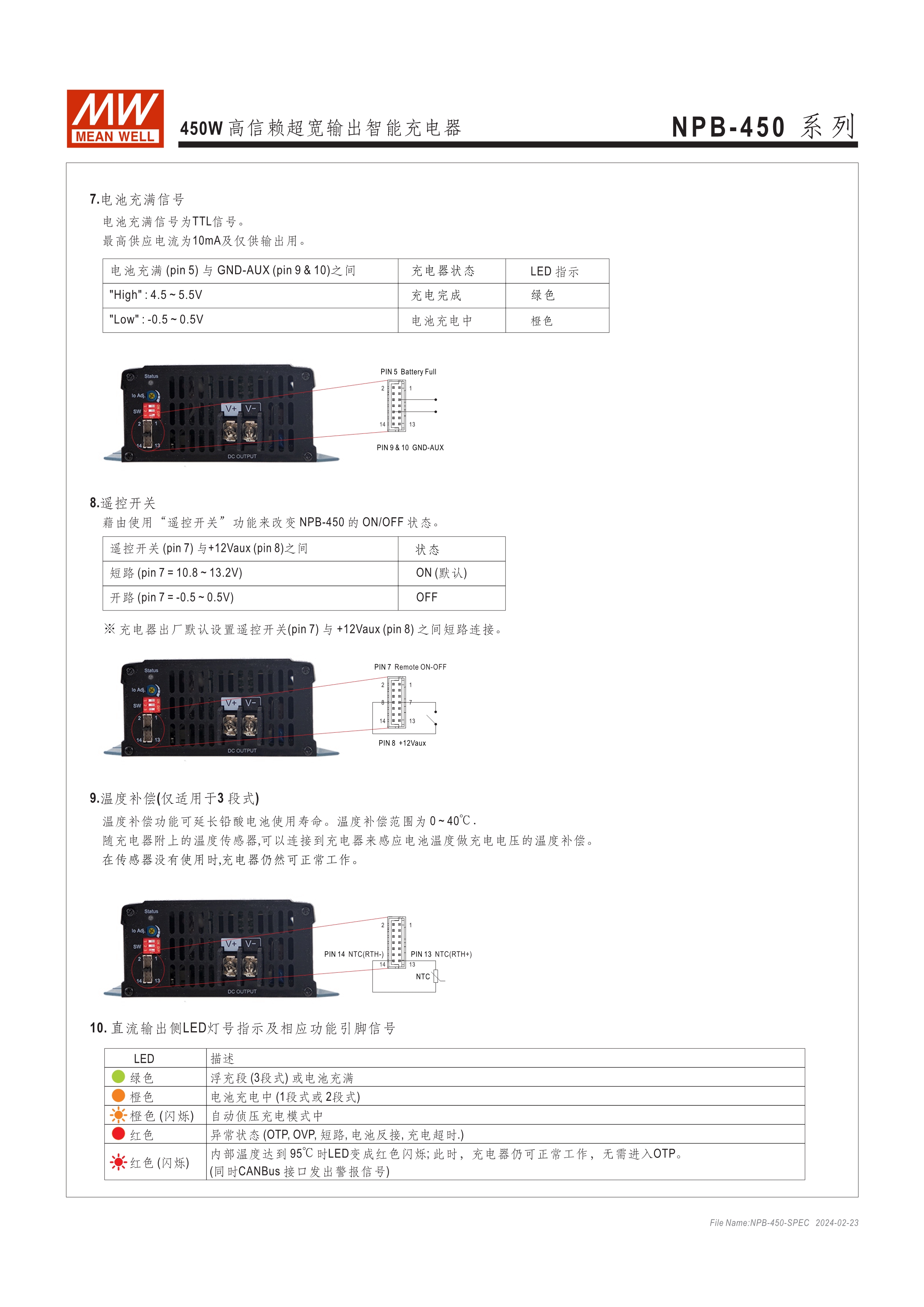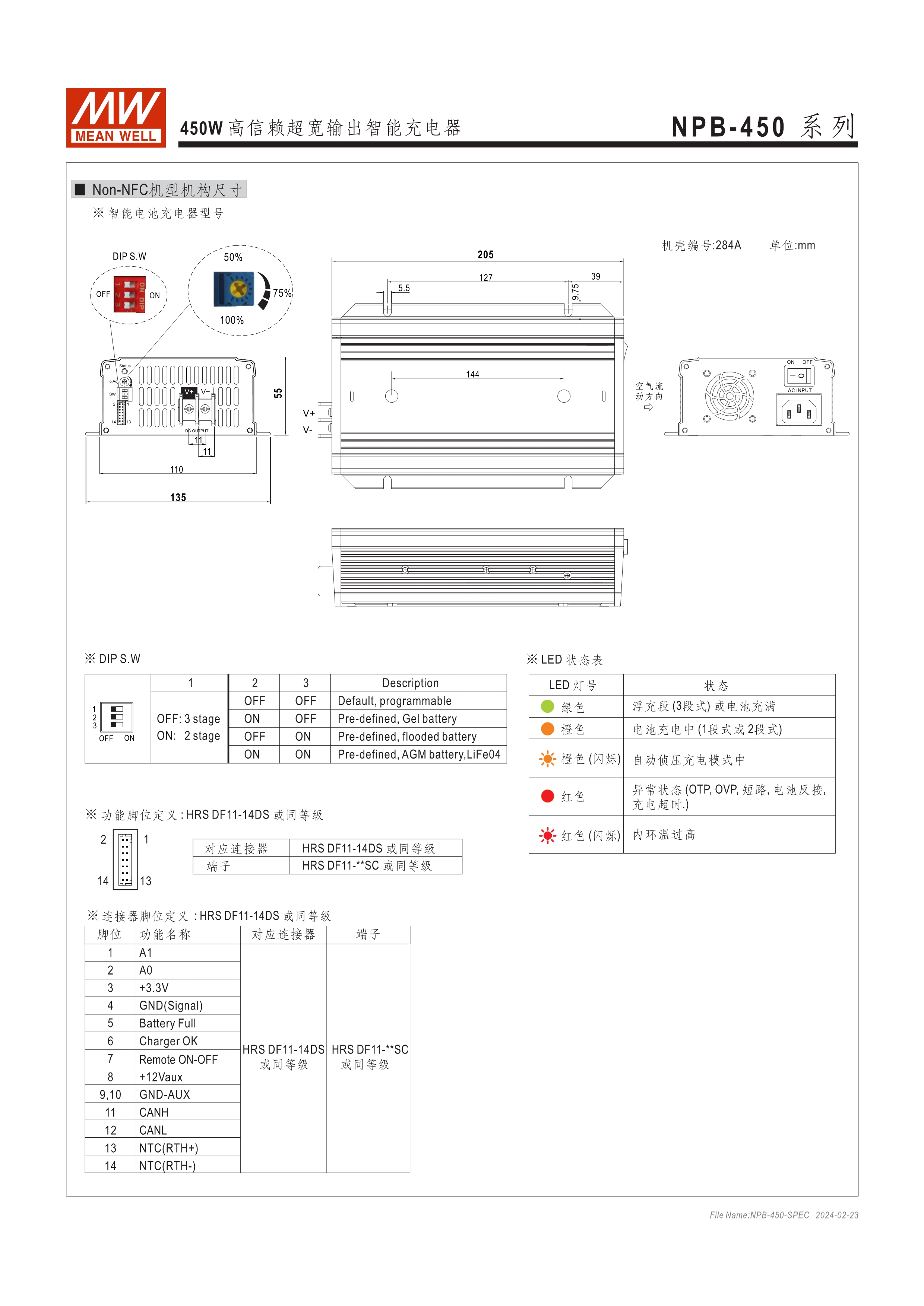 NPB系列:通用型超寬壓智能充電器 超寬壓自動(dòng)偵壓充電 [10.5~21V, 21~42V, 42~80V, 54~100V(僅NPB-450)] 內(nèi)建CANBus通訊介面 搭配SBP-001編程器,可設(shè)定充電電壓、電流、2段或3段、停充時(shí)間 可調(diào)充電電流 (由面板VR調(diào)整50~100%) 透過面板DIP Switch可微調(diào)4種預(yù)設(shè)充電曲線 透過面板DIP Switch可調(diào)2段或3段充電 NTC溫度補(bǔ)償功能 采低噪音溫控風(fēng)扇 過溫度自動(dòng)降載充電 -30~+70oC寬溫度,使用環(huán)境受限少 通過UL/EN62368-1、IEC/EN62368-1/-2-29雙安規(guī)認(rèn)證 適用鉛酸電池、鋰電池 可另購(gòu)手提把手 (Order No.: Carry Handle) 3年保固