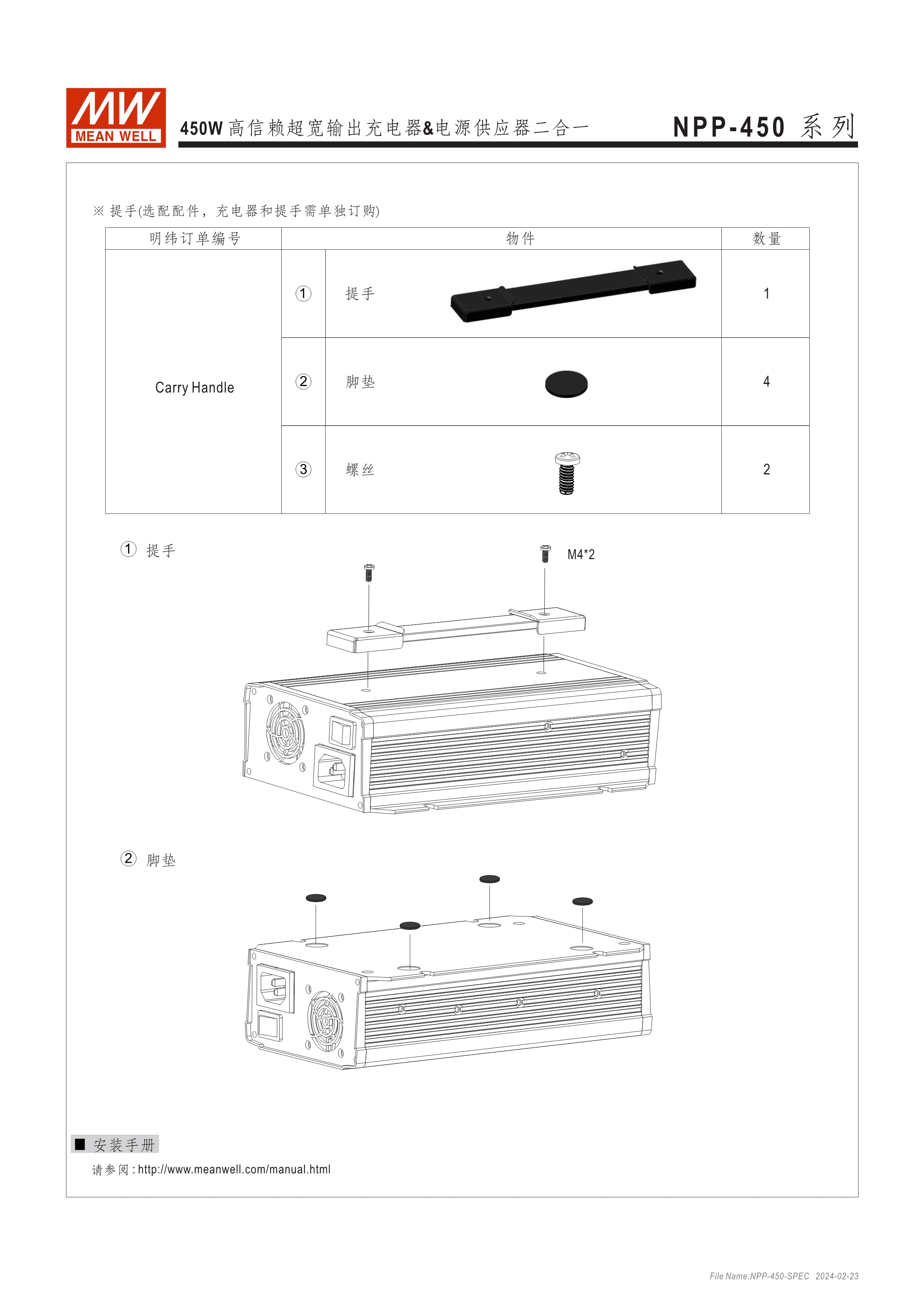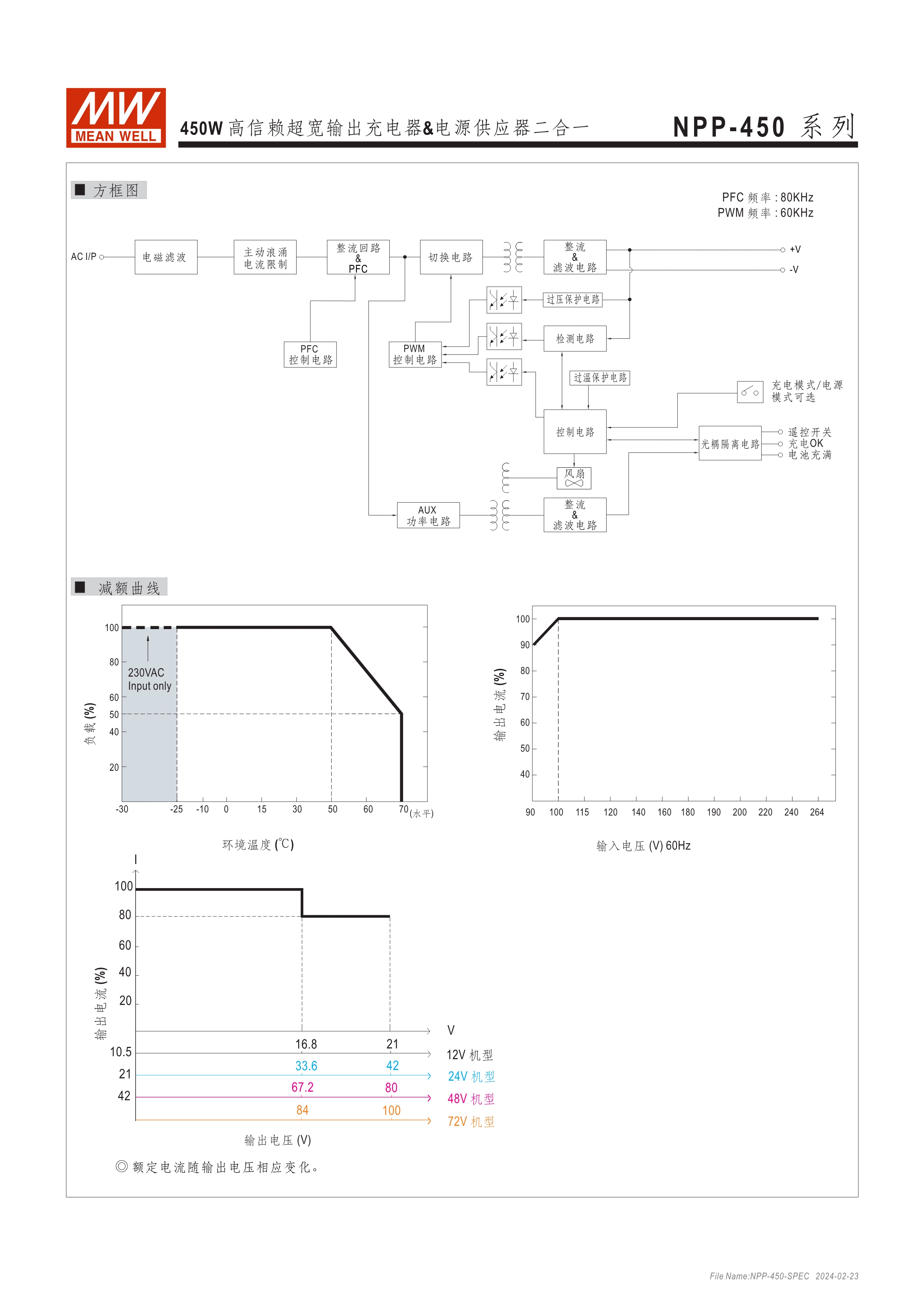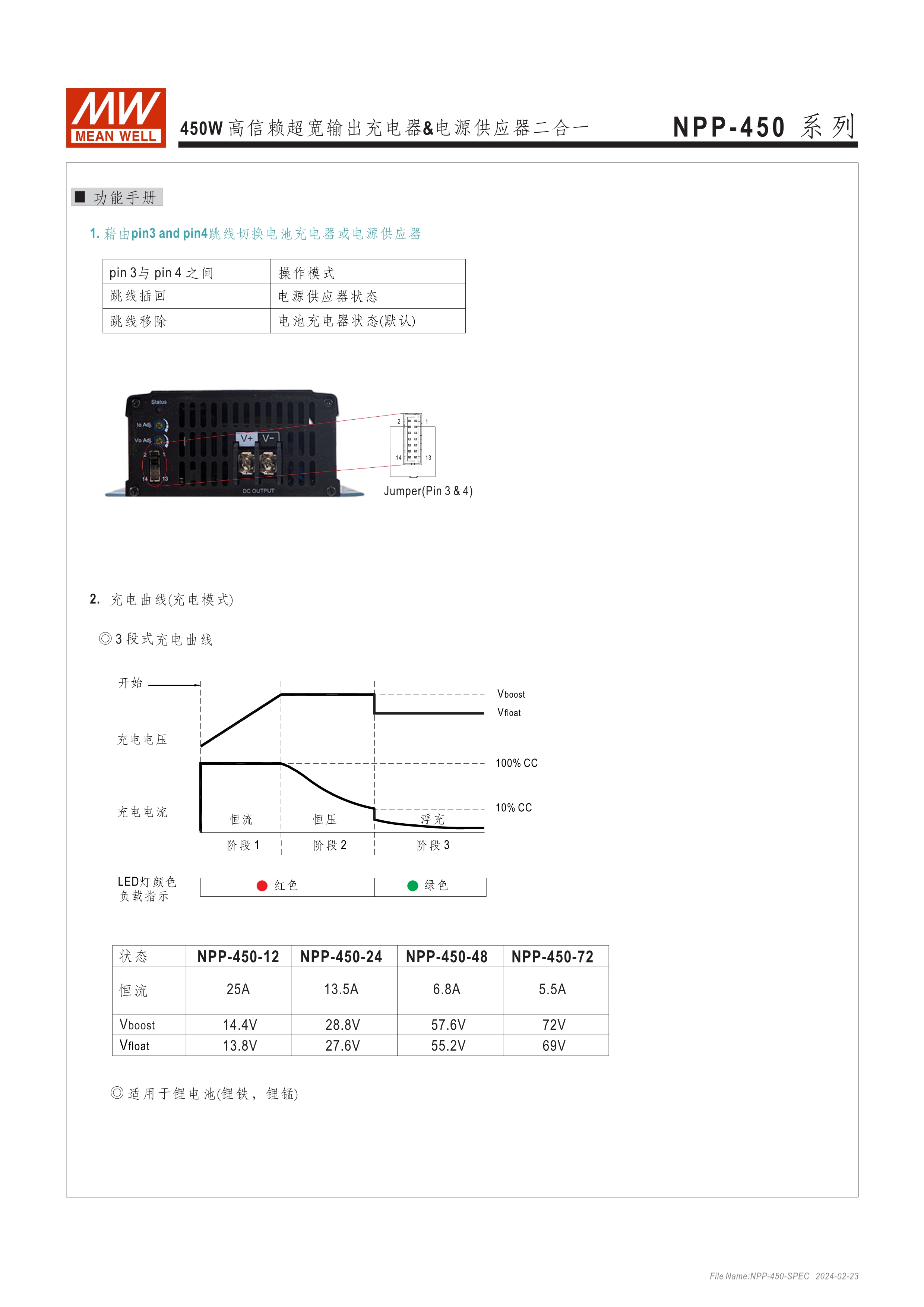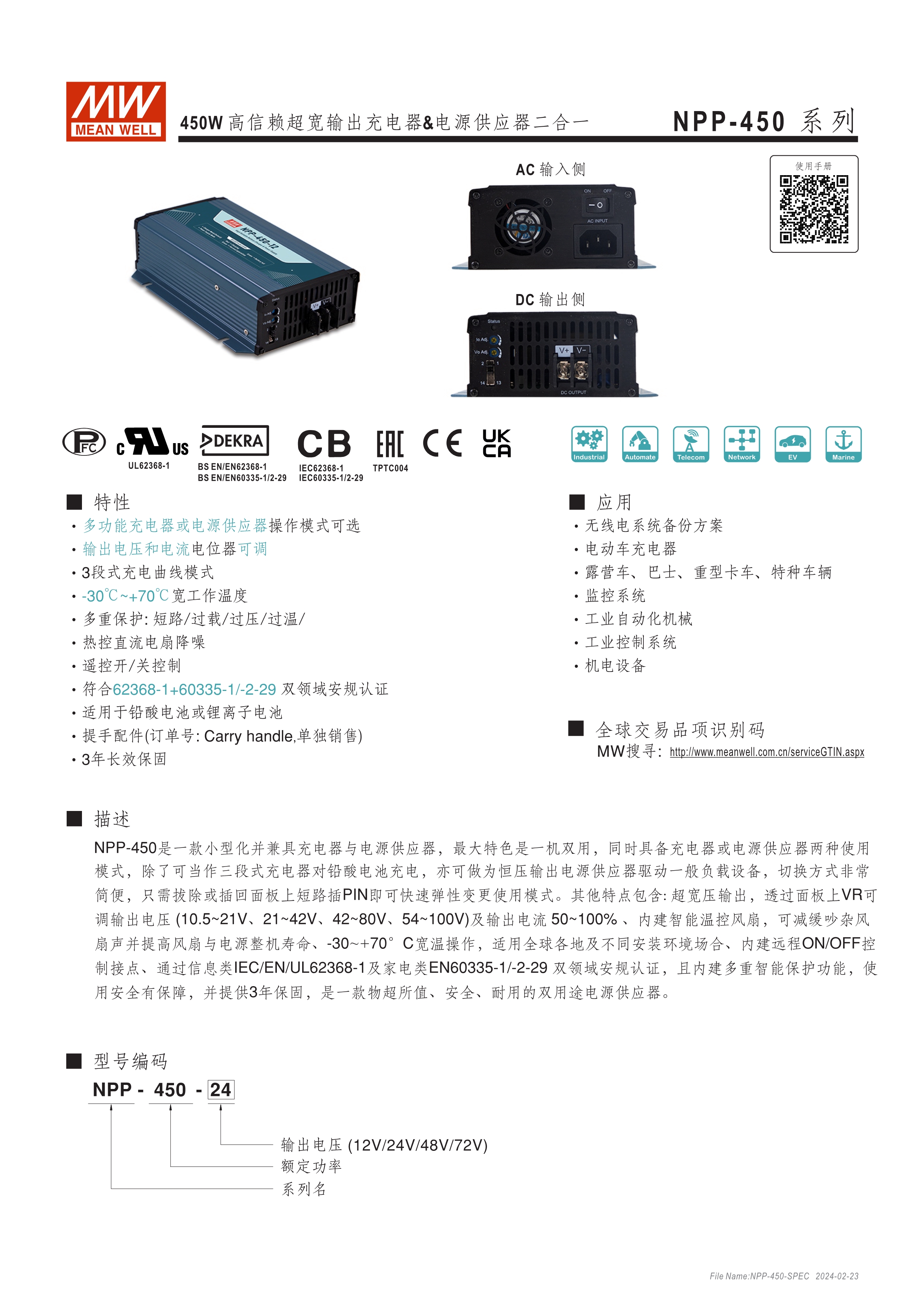 可彈性切換充電器或電源供應(yīng)器 3段式充電,僅適用鉛酸電池 可調(diào)輸出電壓 [由面板VR可調(diào)整10.5~21V, 21~42V, 42~80V, 54~100V(僅NPB-450)] 可調(diào)輸出電流 (由面板VR調(diào)整50~100%) -30~+70oC寬溫度,使用環(huán)境受限少 保護(hù)功能:短路、過壓、過溫度 可另購手提把手 (Order No.: Carry Handle) 通過UL/EN62368-1、IEC/EN62368-1/-2-29雙安規(guī)認(rèn)證 3年保固