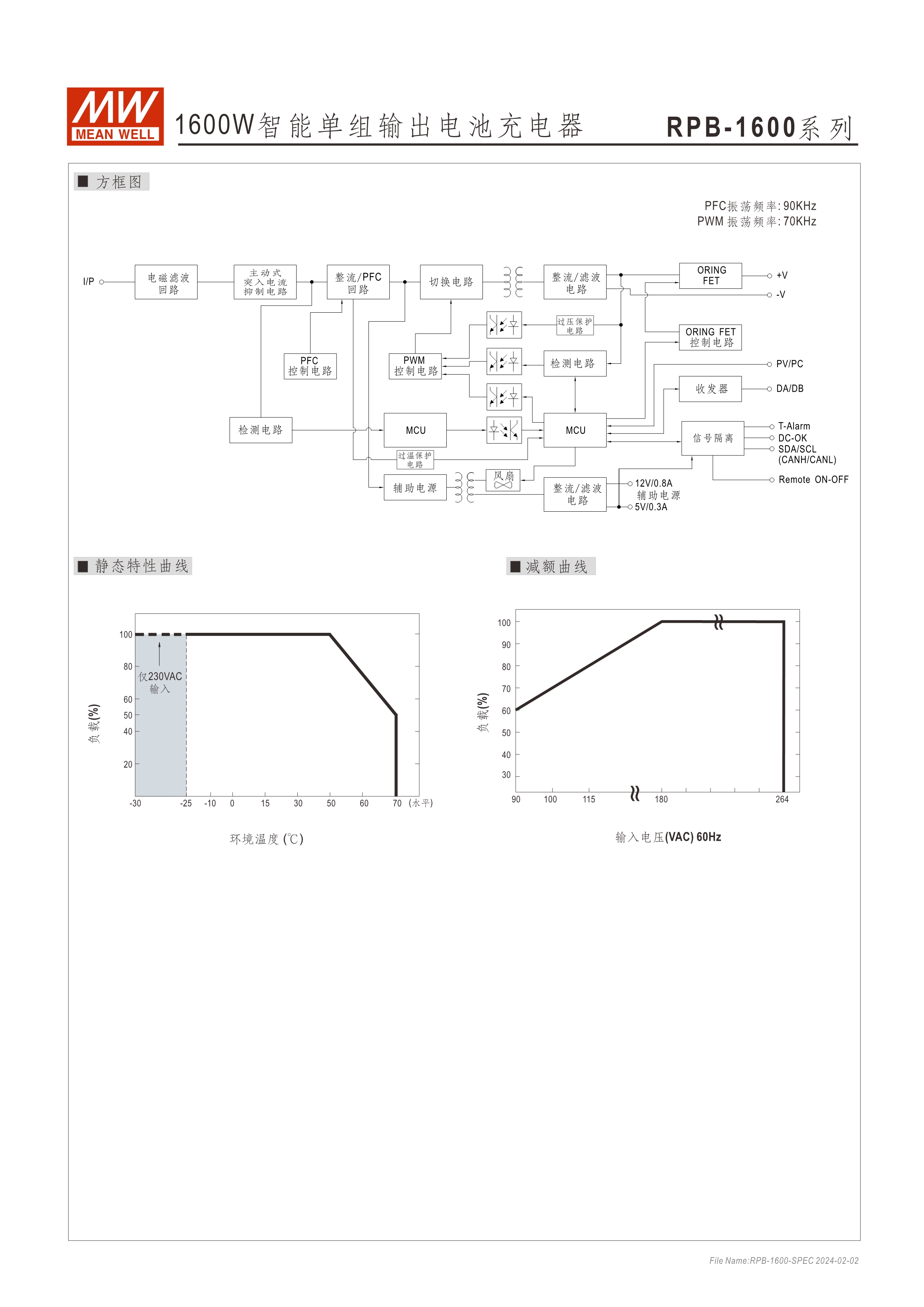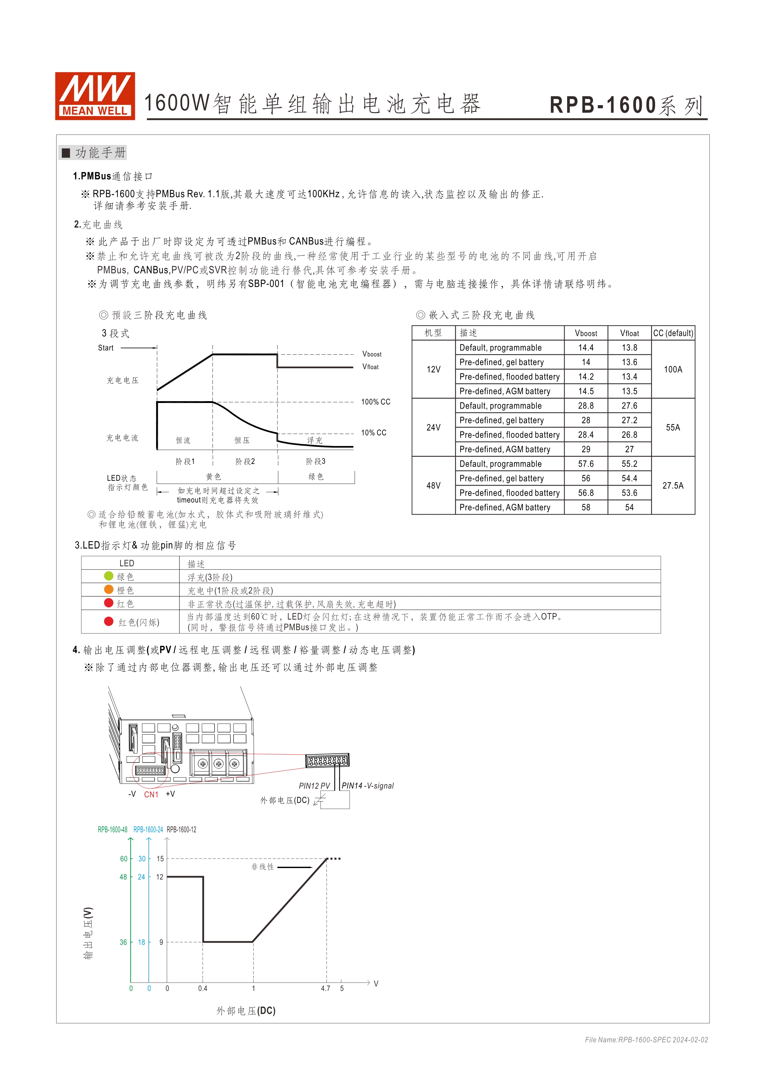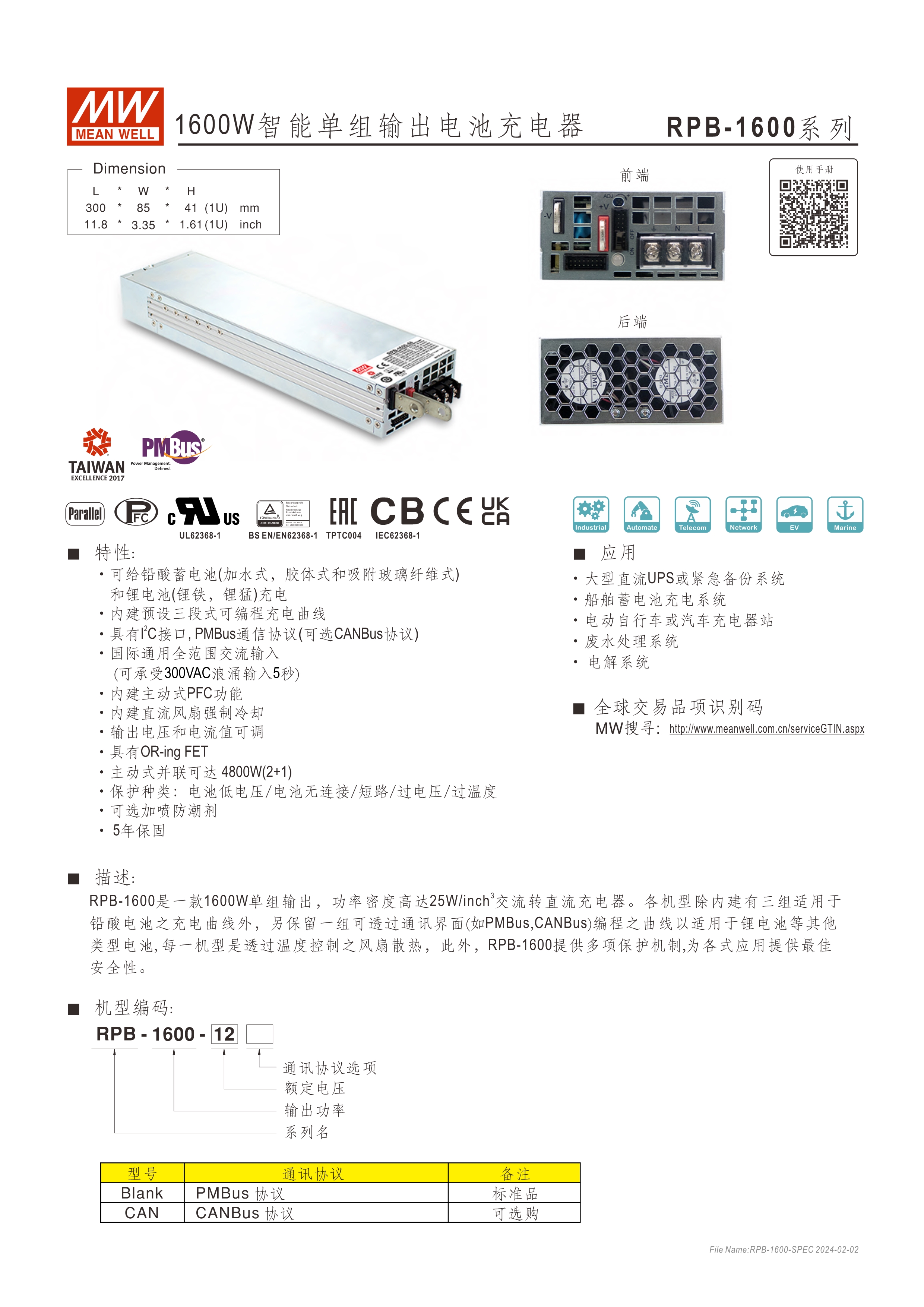 RPB/DBU系列:機殼型充電器 RCB/DBR系列:Rack機架型充電器 功率密度高達37W/in3 內(nèi)建I2C/PMBus通訊介面 (CANBus選購) 搭配SBP-001編成器,可設定充電電壓/電流、2段或3段、停充時間 透過外加1~5Vdc,可調(diào)充電電壓75~125% (10.8~18V,21.6~36V, 43.2~72V) 藉由外加1~5Vdc,可調(diào)充電電流20~100% 內(nèi)建OR_ing MOSFET,支援熱插拔 (僅RCB-1600/DBR-3200系列) 均流并聯(lián)最高可達25600W 保護功能:電池過低、未接好、短路、過溫度 通用鉛酸電池或鋰電池 5年保固