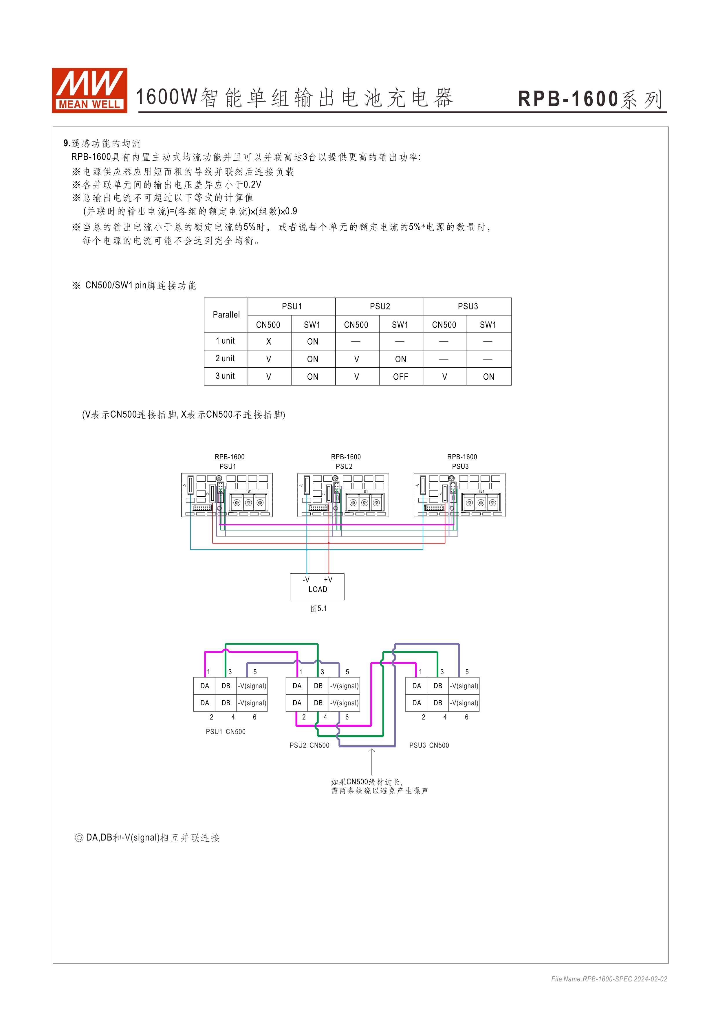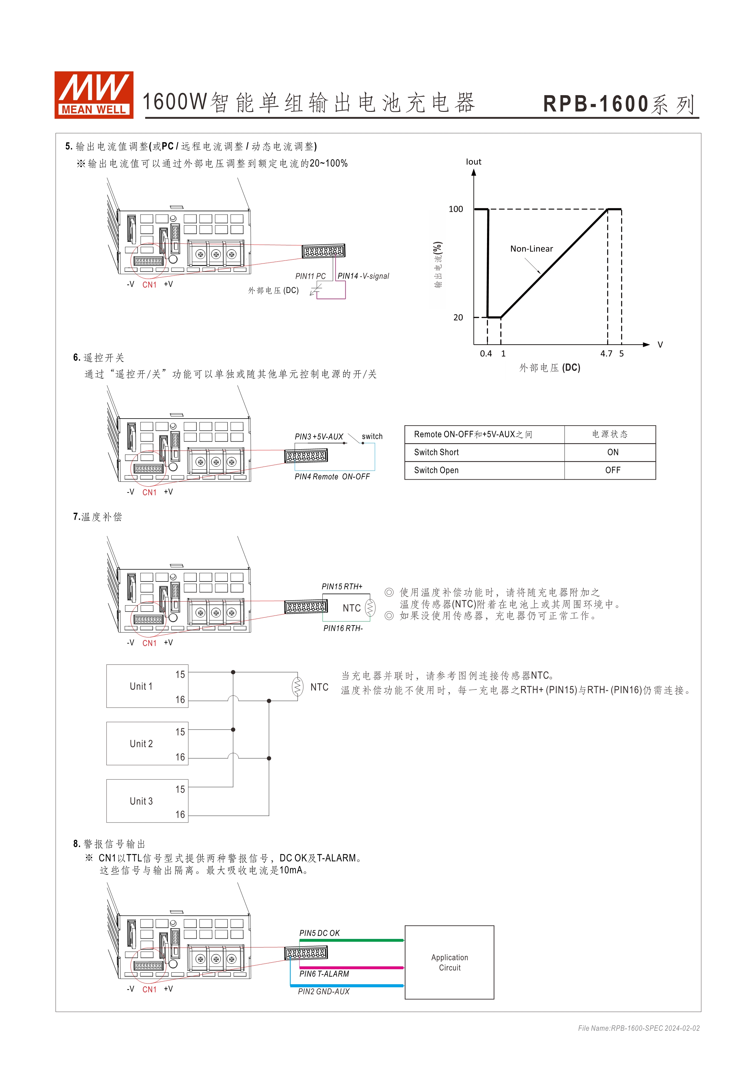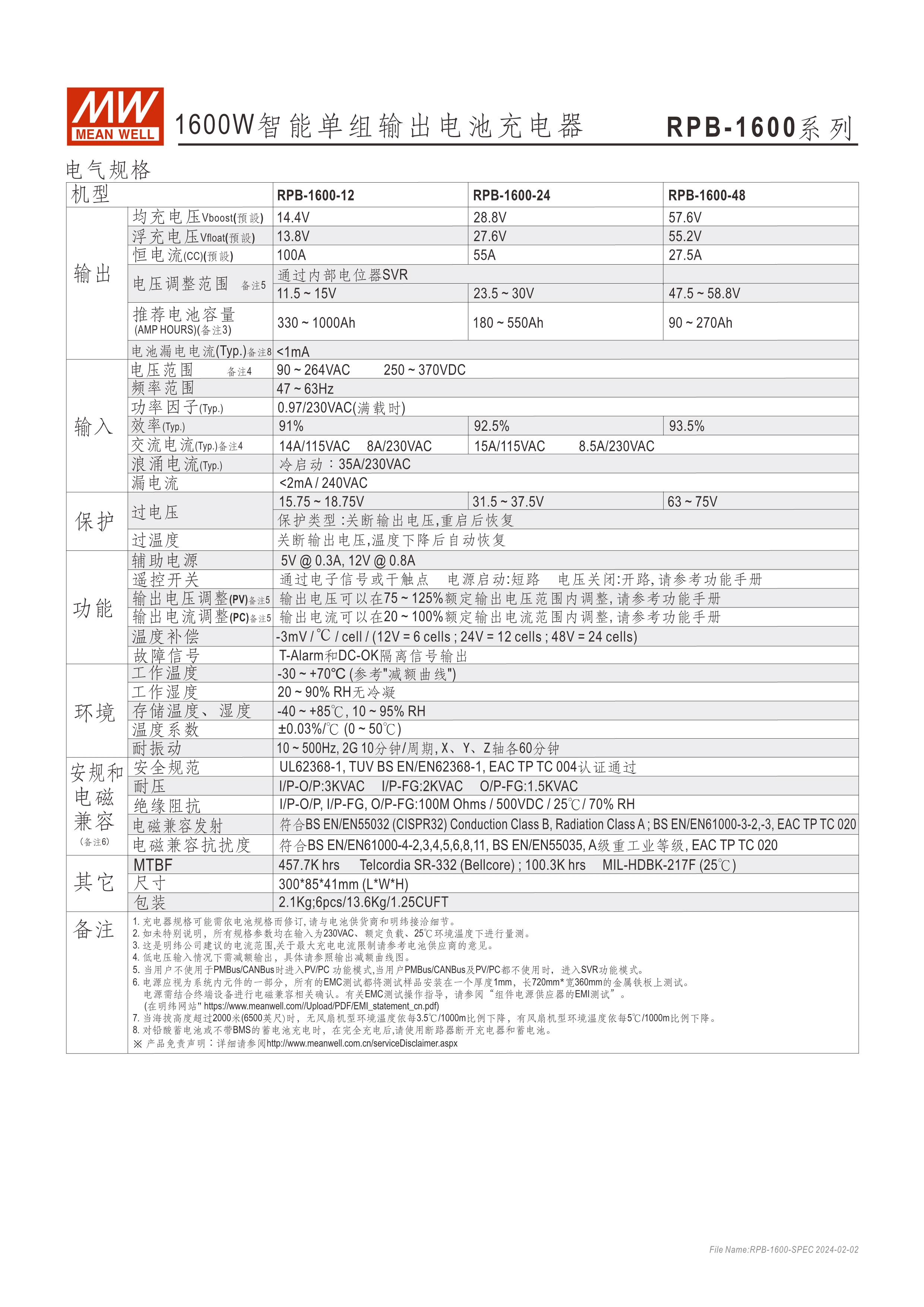 RPB/DBU系列:機殼型充電器 RCB/DBR系列:Rack機架型充電器 功率密度高達37W/in3 內(nèi)建I2C/PMBus通訊介面 (CANBus選購) 搭配SBP-001編成器,可設定充電電壓/電流、2段或3段、停充時間 透過外加1~5Vdc,可調(diào)充電電壓75~125% (10.8~18V,21.6~36V, 43.2~72V) 藉由外加1~5Vdc,可調(diào)充電電流20~100% 內(nèi)建OR_ing MOSFET,支援熱插拔 (僅RCB-1600/DBR-3200系列) 均流并聯(lián)最高可達25600W 保護功能:電池過低、未接好、短路、過溫度 通用鉛酸電池或鋰電池 5年保固