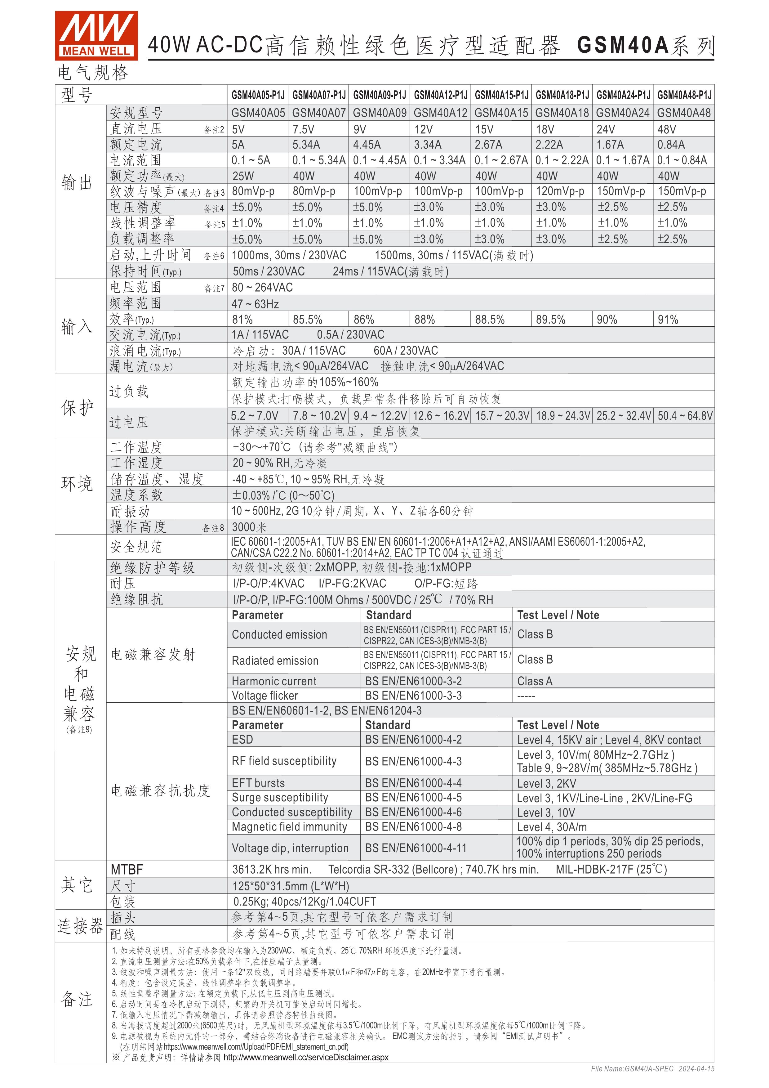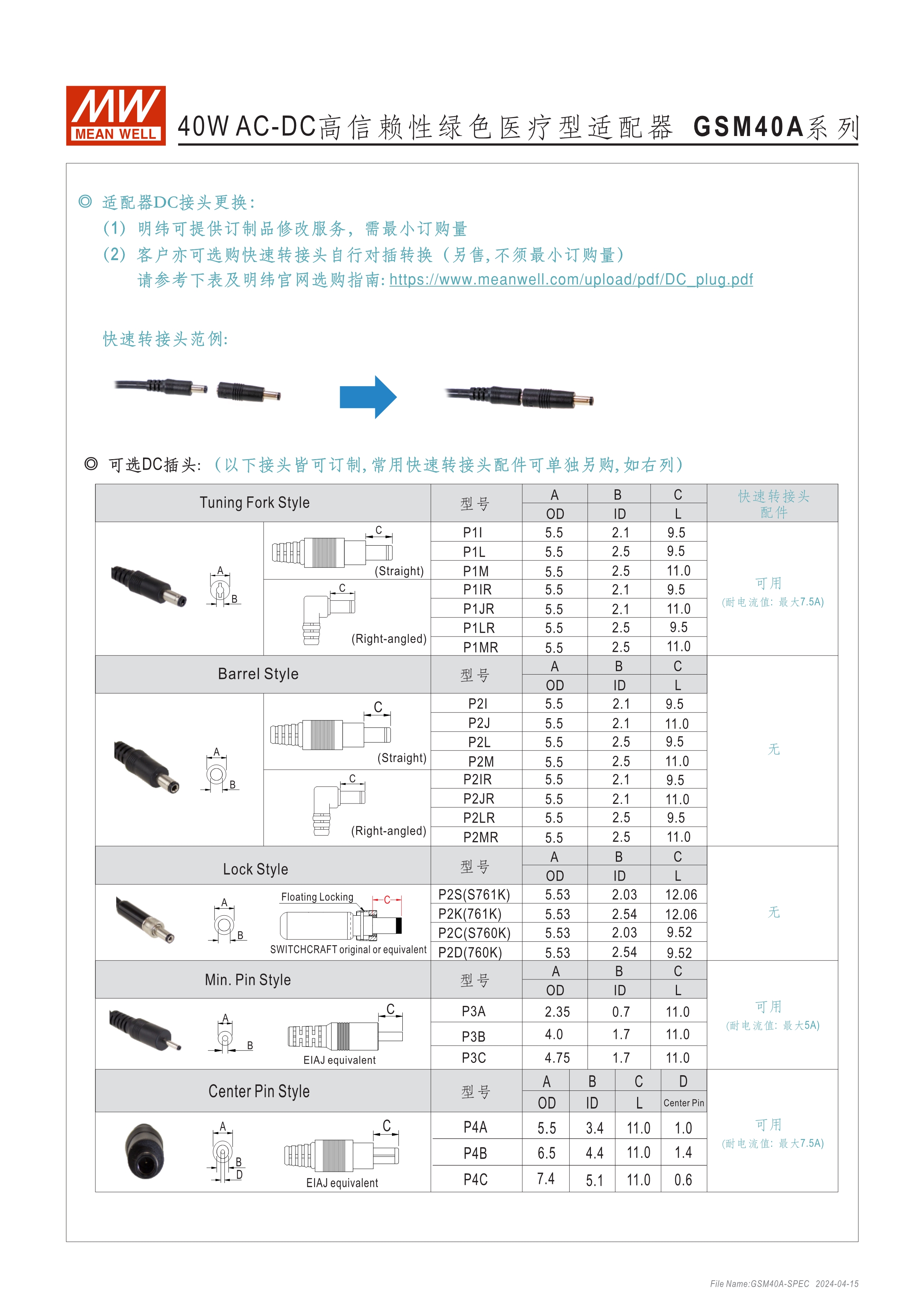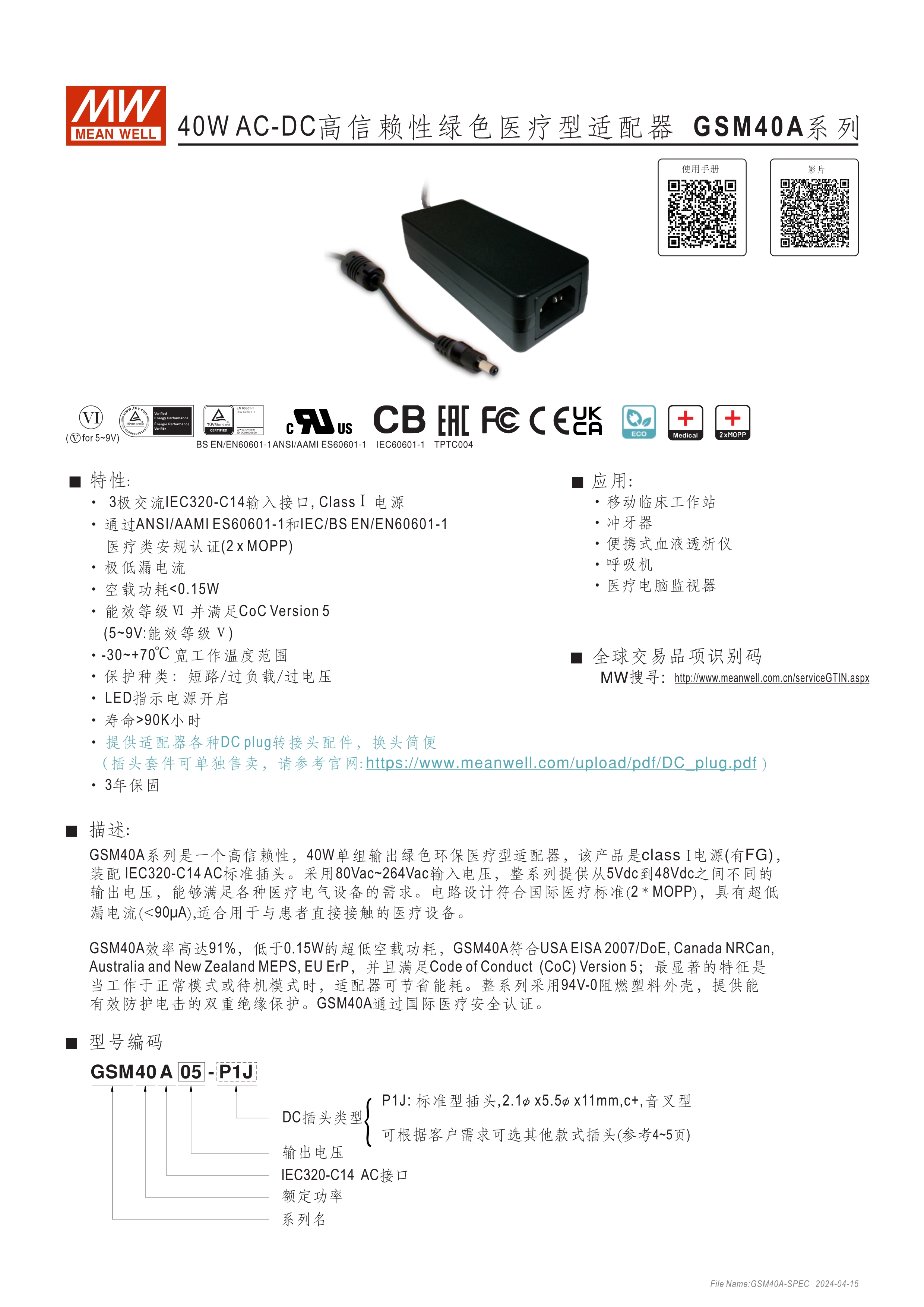 通過(guò)醫(yī)療60601-1認(rèn)證(2xMOPP),BF應(yīng)用(僅B型) 能效 VI 級(jí) 空載損耗<0.1W~0.15W 符合EISA/DoE、NRCan、ErP 及CoC Version 5 A型:Class I 電源(有接地PIN),IEC 320-C14接口 B型:Class II 電源(無(wú)接地PIN),IEC 320-C8接口 極端漏電流<50~175uA(依型號(hào)) -30~+70℃工作溫度 多種DC輸出轉(zhuǎn)接頭可更換 3年保固