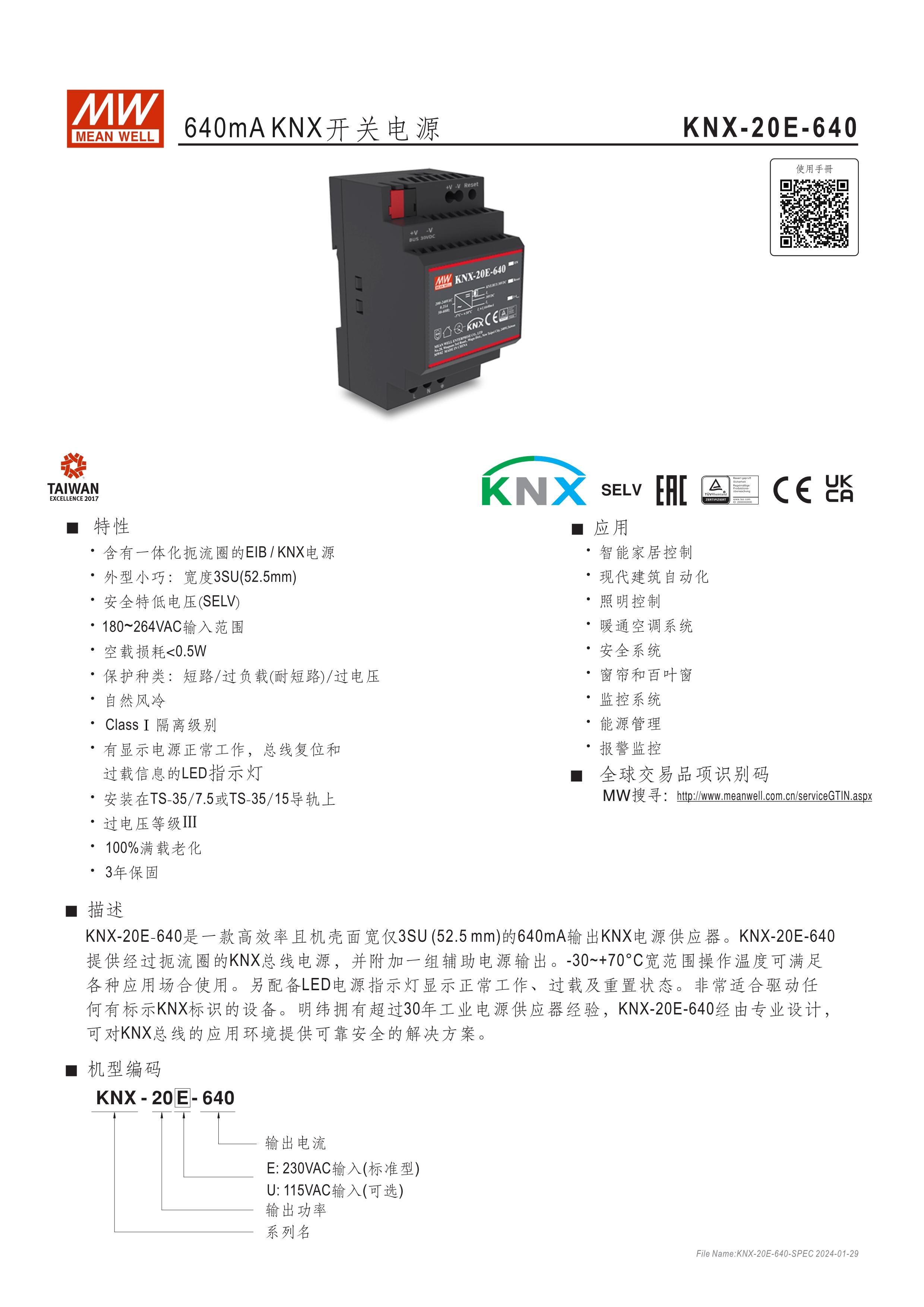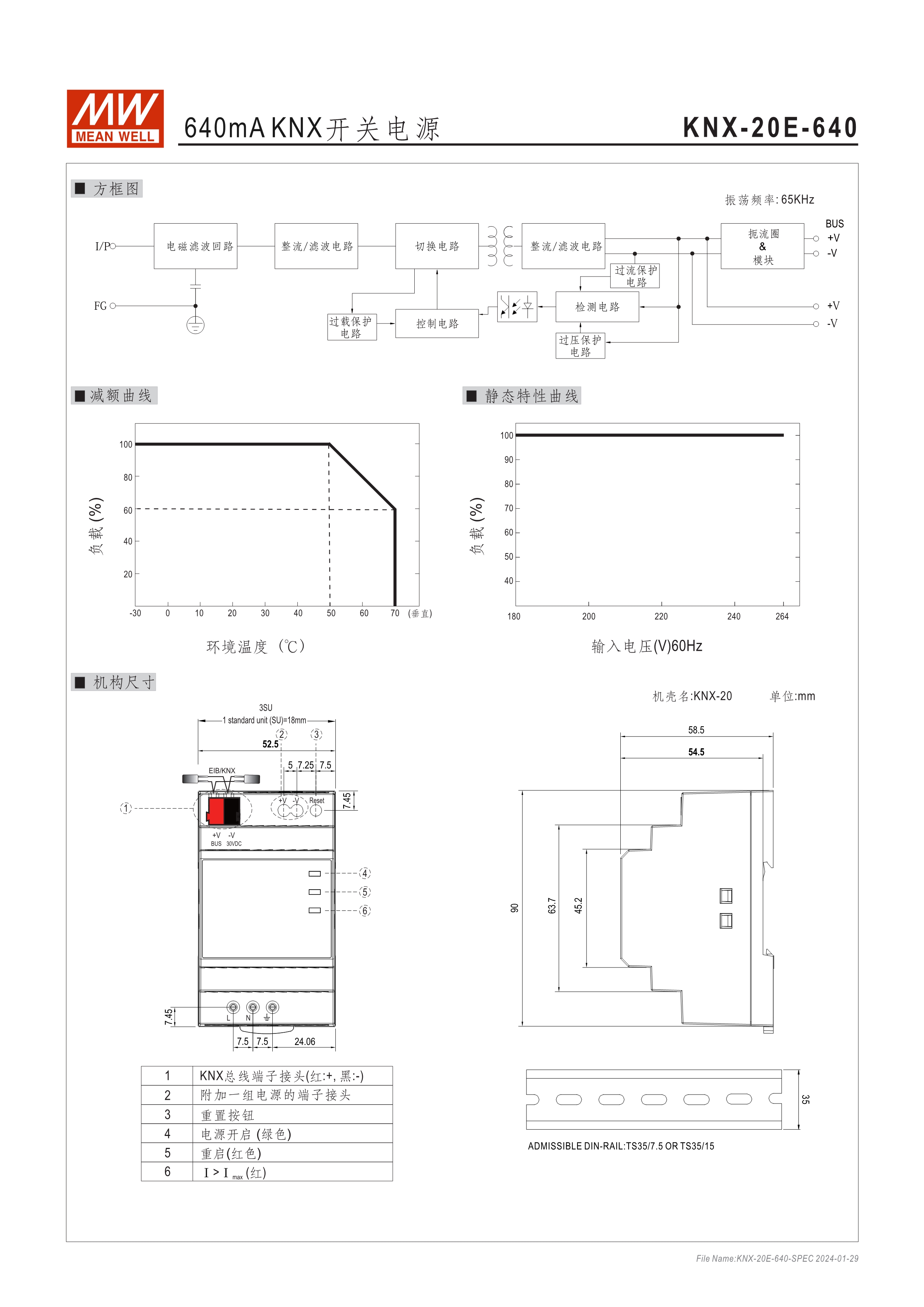EIB/KNX 電源供應(yīng)器(具積體電感) 單相, 180~264VAC input 輸入范圍 空載待機(jī)消耗瓦數(shù)<0.5W 適合安裝于DIN Rail TS-35 / 7.5或15