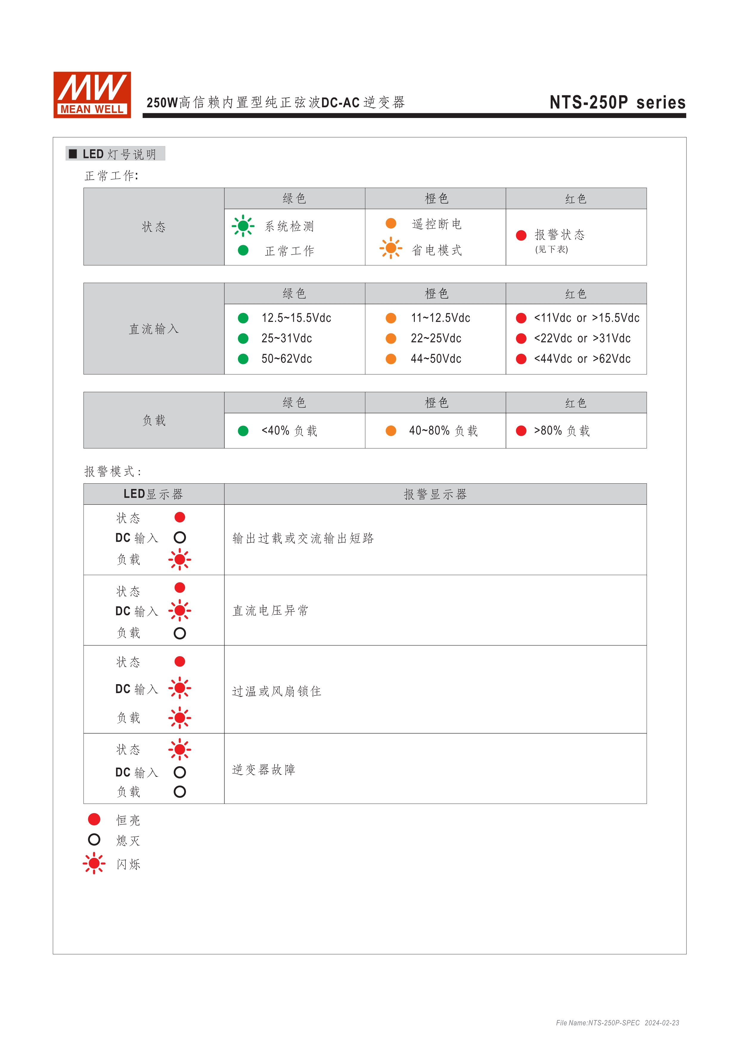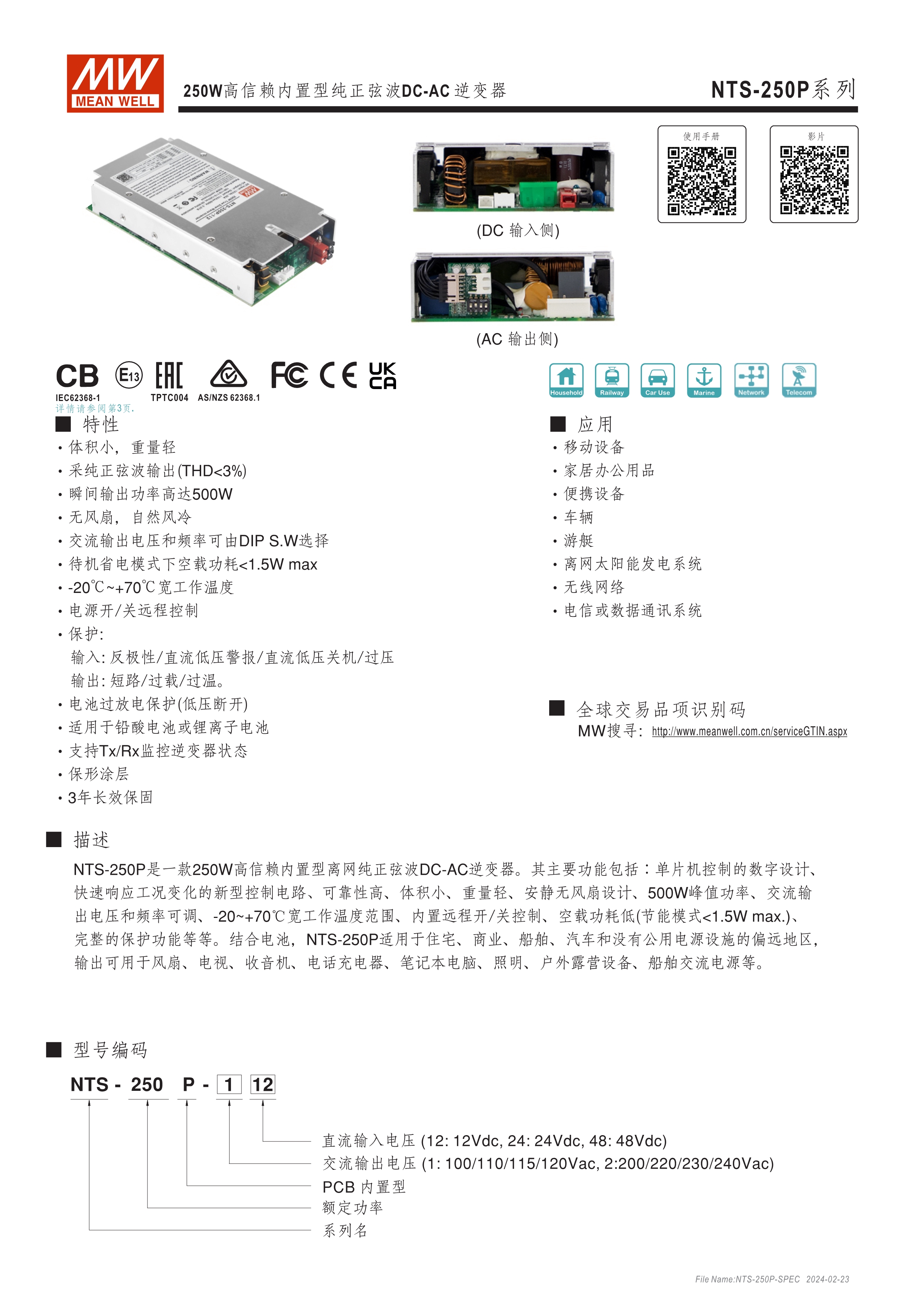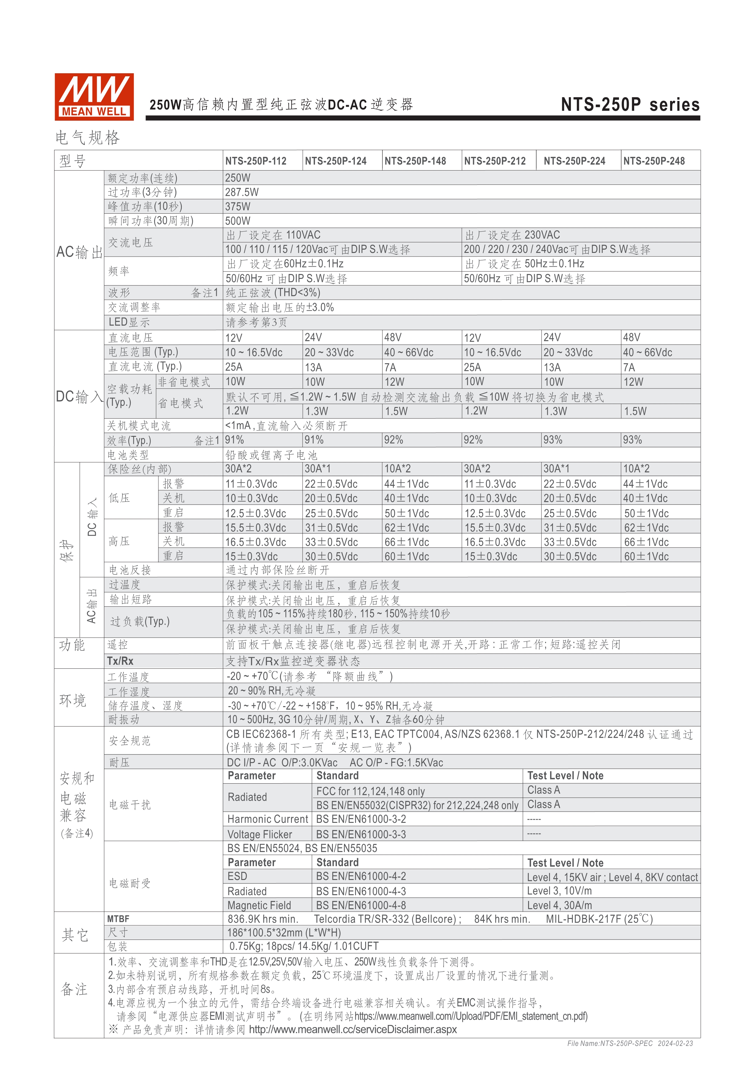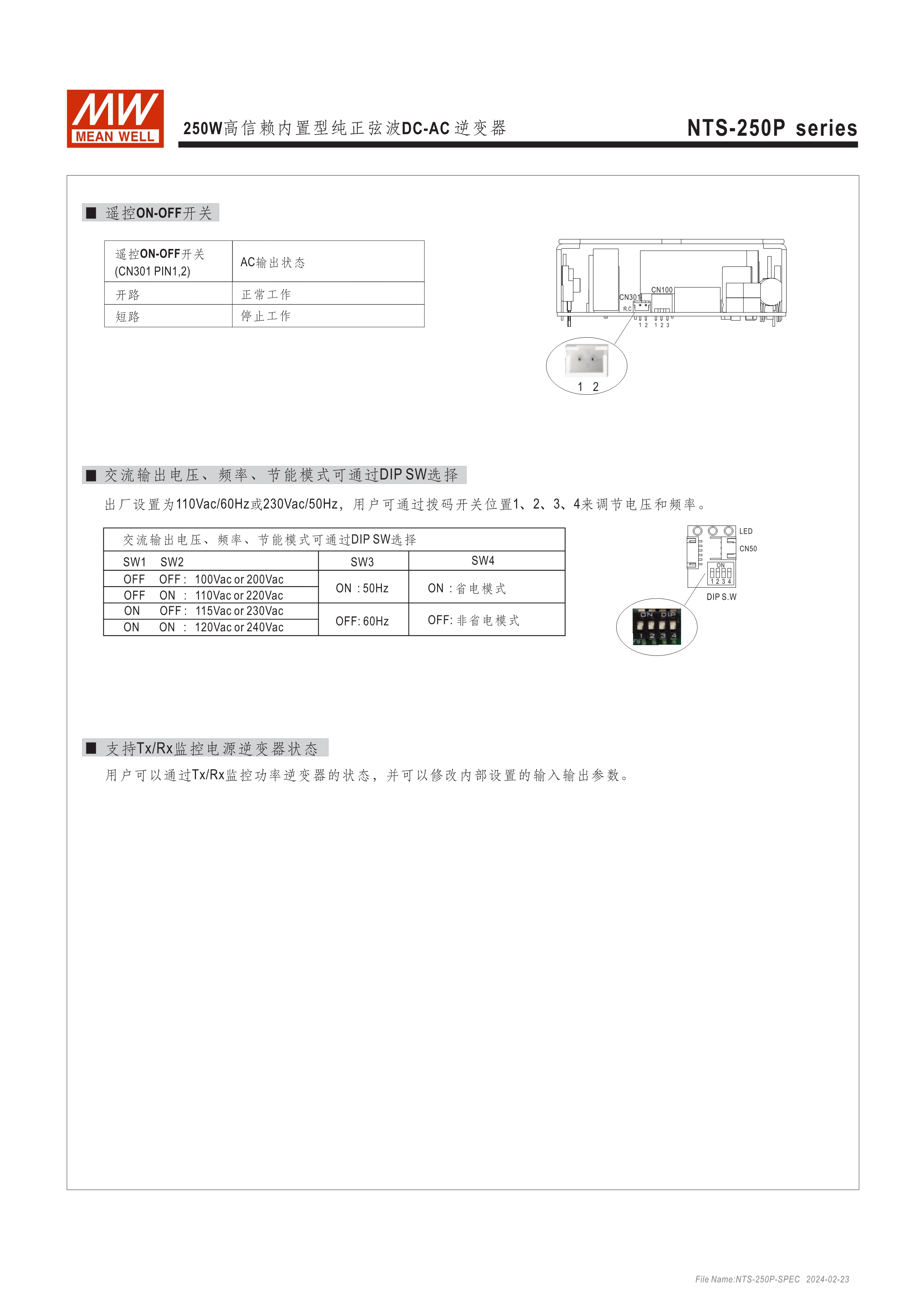 DC-AC純正弦波輸出 (THD<3%) 無風(fēng)扇設(shè)計,效率最高達(dá)93%,可自然風(fēng)冷散熱 瞬間峰值功率達(dá)雙倍輸出 內(nèi)建DIP S.W可彈性自調(diào)AC輸出電壓、頻率、節(jié)能模式 多重智能保護功能: DC輸入側(cè) - 極性反接、電壓過低、電壓過高保護 AC輸出側(cè) - 短路、超載、過熱保護