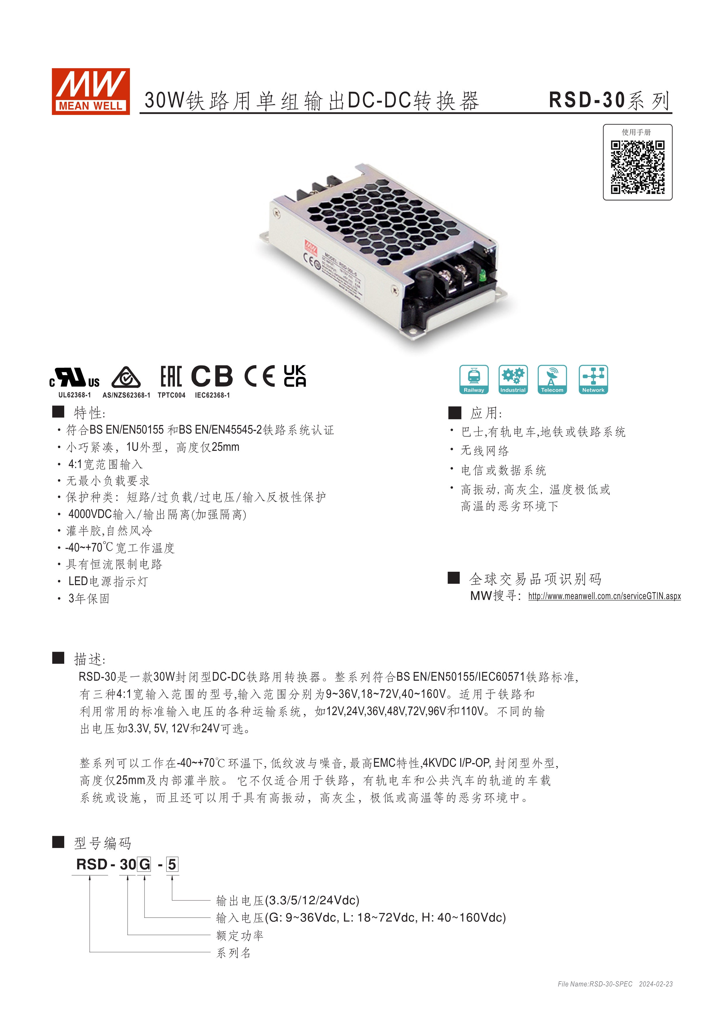 符合 EN50155 及 EN45545-2鐵道法規(guī)認證 2:1 或 4:1 寬輸入范圍 4000VDC 輸入/輸出隔離 1U 低高度 灌半膠 適用于電池備援系統(tǒng)或各式交通工具上