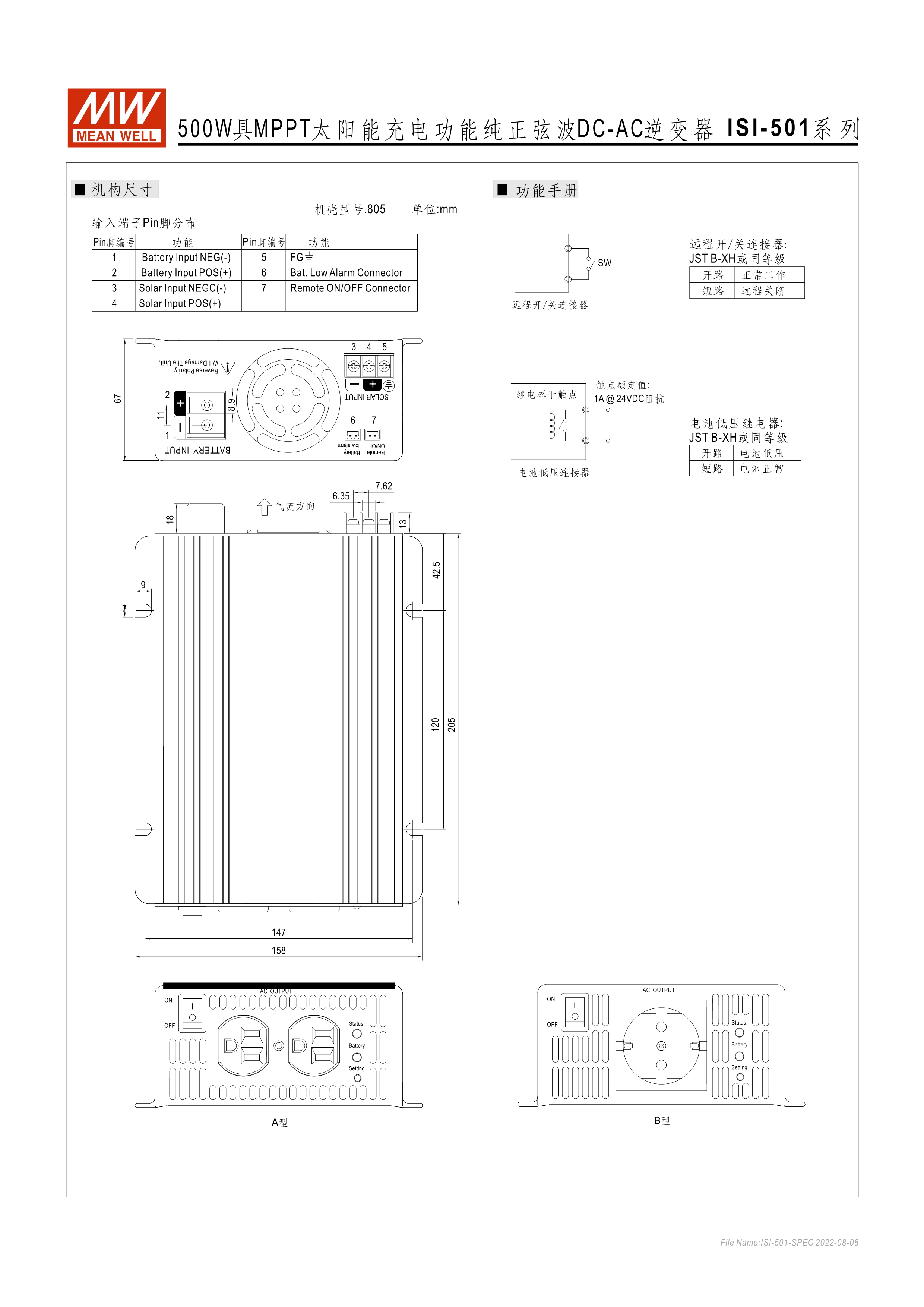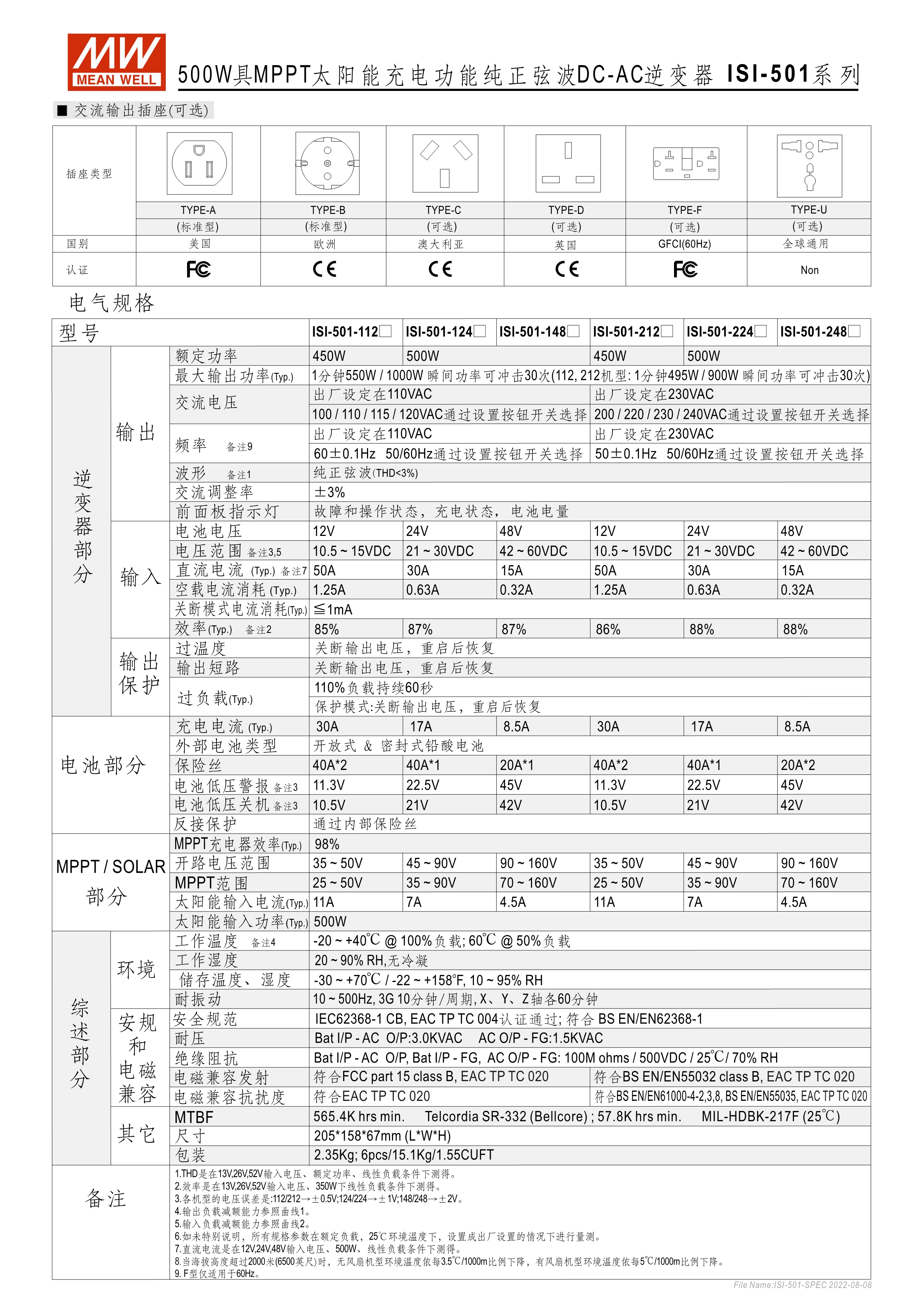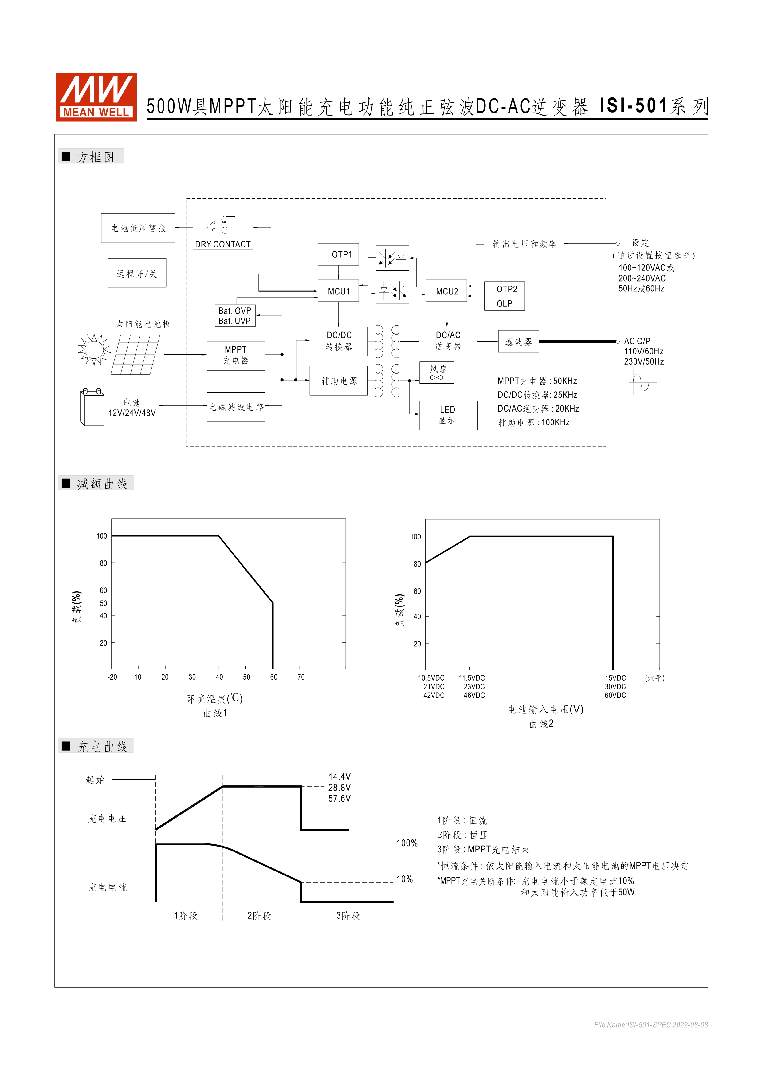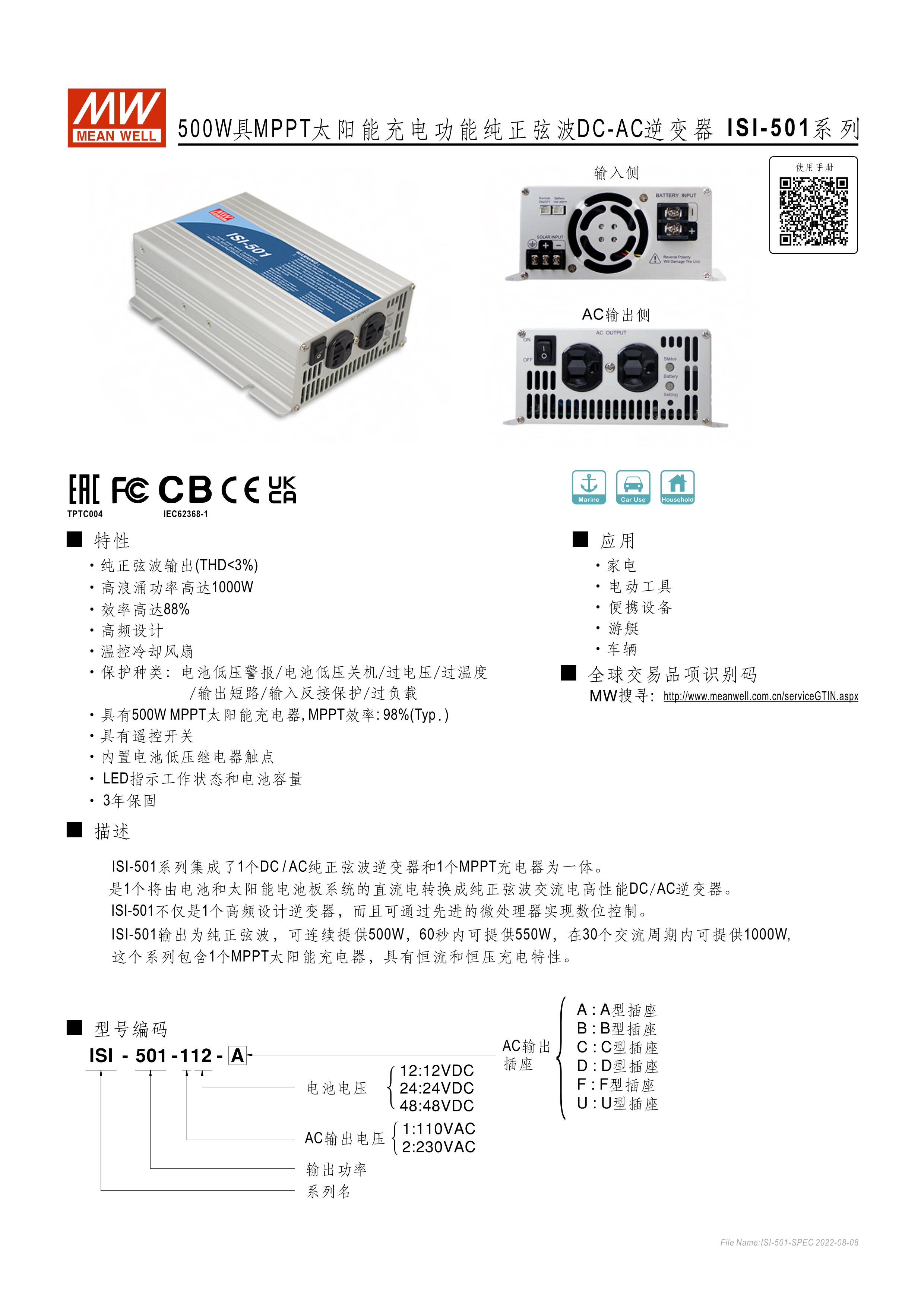 ISI-500: 內(nèi)建MPPT太陽(yáng)能充電器方波輸出機(jī)種 ISI-501: 內(nèi)建MPPT太陽(yáng)能充電器正弦波輸出機(jī)種 具備可瞬間承受200%輸出之能力 ISI-500系列為2年保固期; ISI-501系列為3年保固